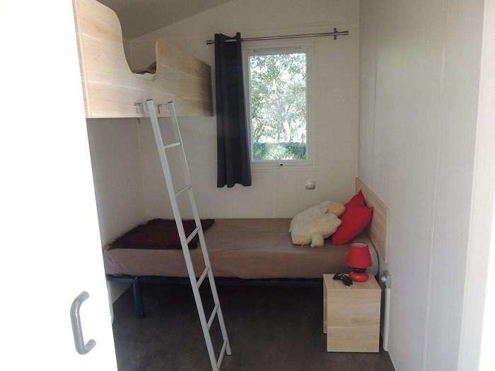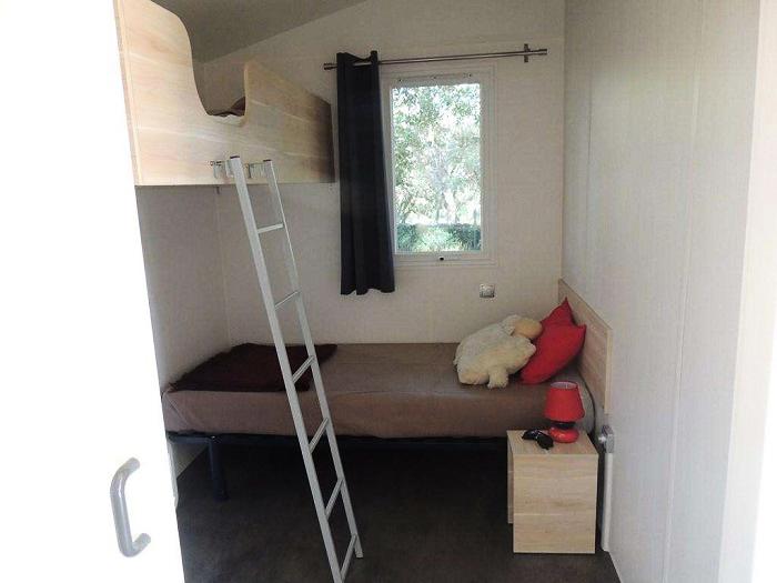 Mobil Home 3 Pièces 5 Personnes de 30m², composé d'une cuisine équipée, d'un coin salon, d'une chambre avec un lit double, d'une chambre avec 3 lits simples dont 1 superposé, d'une salle d'eau avec WC séparé, d'une terrasse.