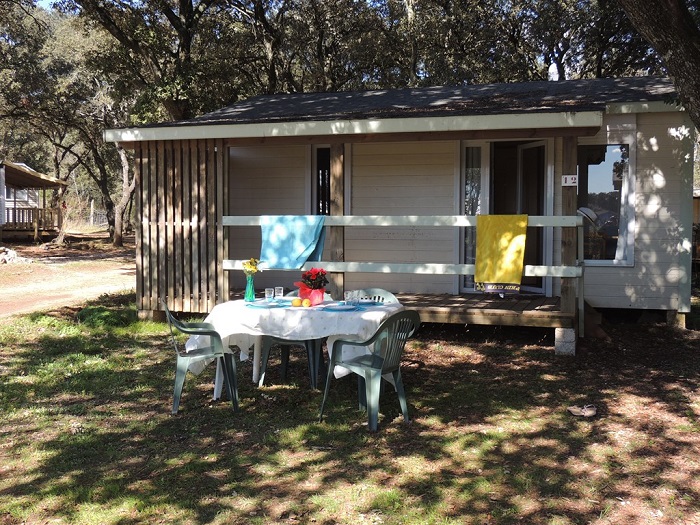 Chalet pour 5/7 personnes, de 27m², composé d'une cuisine, d'un coin salon avec canapé convertibles pour 2 personnes, d'une chambre avec un lit double, d'une seconde chambre avec un lit double et un lit superposé, d'une salle de bains avec douche et WC, d'une terrasse couverte de 11m².
