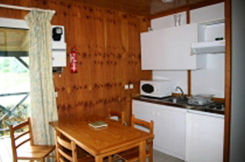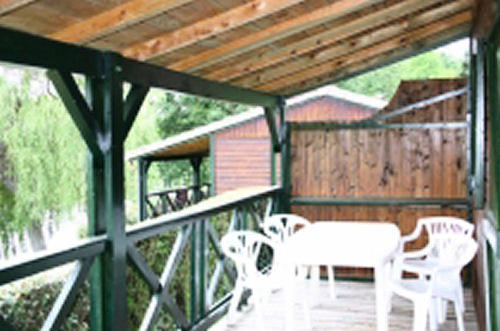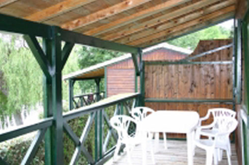 Chalet de 35m² pour 6 personnes, composé d'une kitchenette équipée, d'un séjour avec un coin repas et un canapé convertible en couchage pour 2 personnes, d'une chambre avec un lit double, d'une chambre avec 2 lits simples, d'une salle de bains avec une douche , d'un WC séparé et d'une terrasse couverte de 14m².