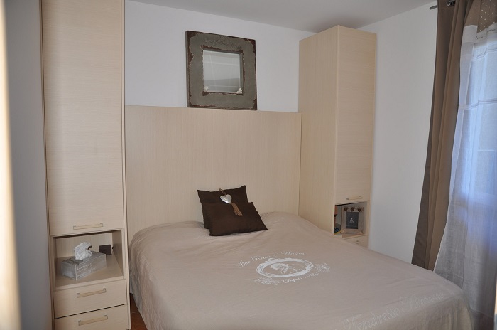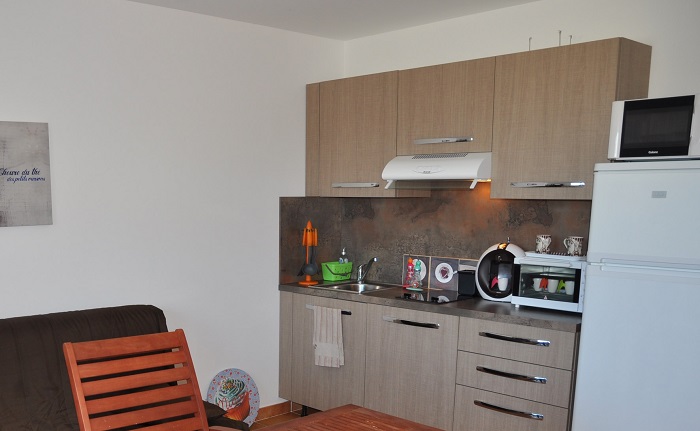Appartement composé d'un coin cuisine équipé avec réfrigérateur/congélateur, plaques de cuisson, micro-ondes, lave-vaisselle, ustensiles de cuisine, vaisselle pour 4 personnes. Salon de jardin. L'appartement dispose de la climatisation.