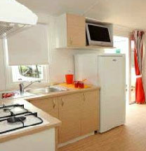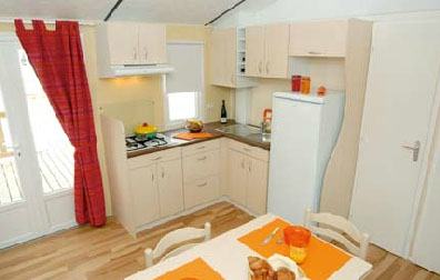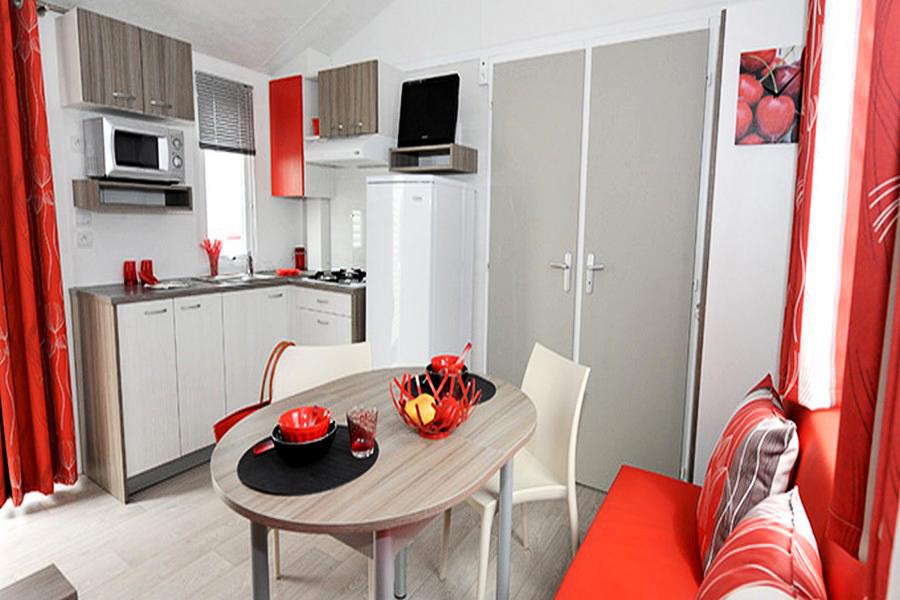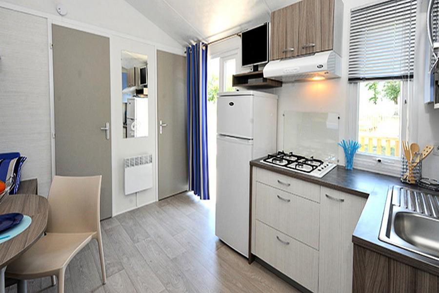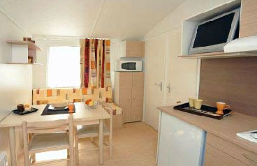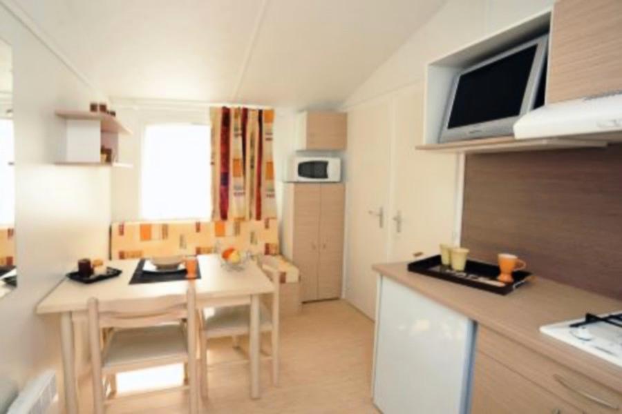 Le Mobil home est composé d'un coin salon avec télévision, d'une cuisine équipée de réfrigérateur, four à micro-ondes, cafetière électrique, plaque de cuisson, kit vaisselle complet ainsi que tous les ustensiles de cuisine nécessaires.