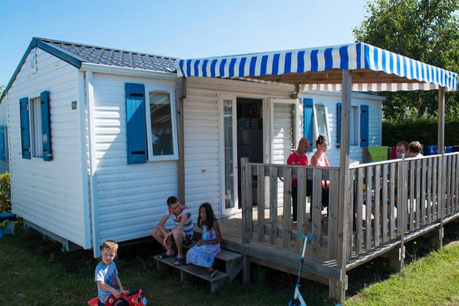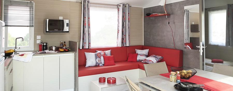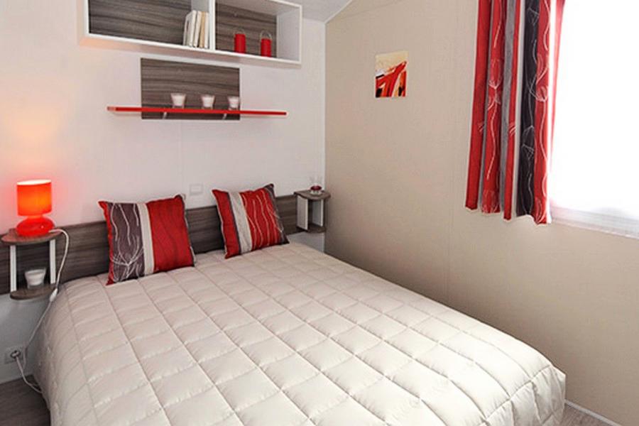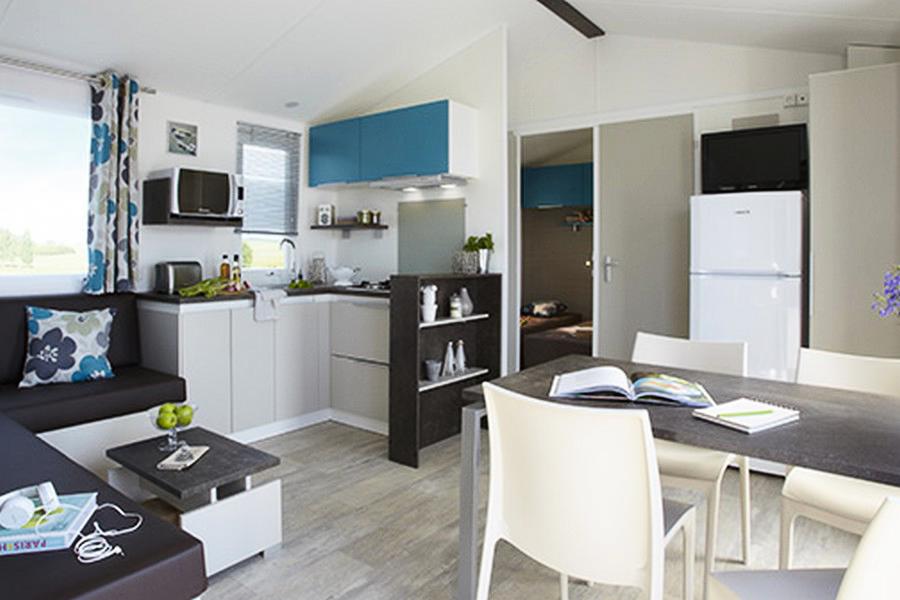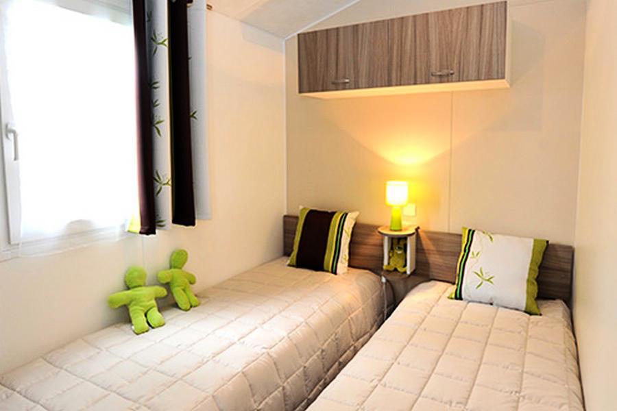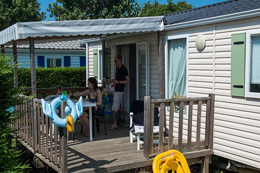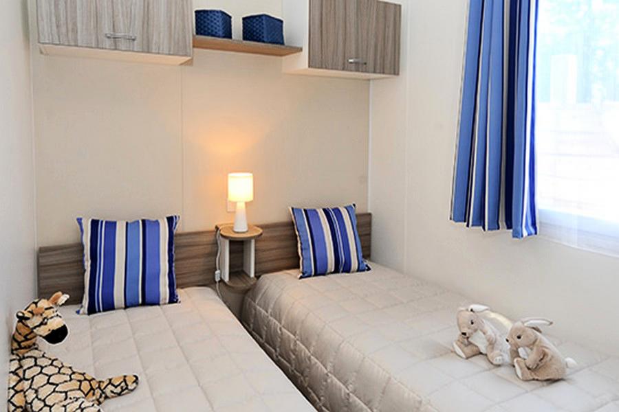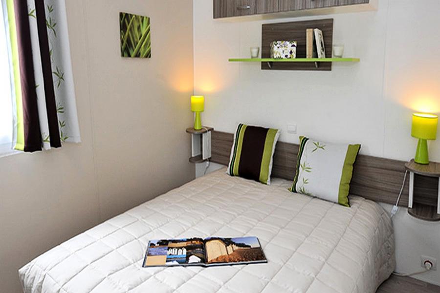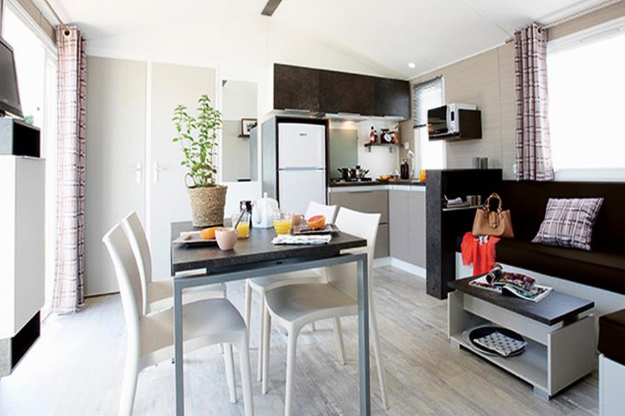 Le mobil home 3 pièces de 28m² pouvant accueillir de 4 à 5 personnes est composé d'une kitchenette, d'une salle de douche, de WC séparés, d'une chambre comprenant 1 lit double, d'une seconde chambre avec deux lits simples, un salon avec banquette convertible en lit deux couchages et d'une terrasse. Possibilité d'intégrer un lit bébé dans la chambre double. Certains modèles sont accessibles aux personnes à mobilité réduite (il est important de vérifier la disponibilité avant de réserver)