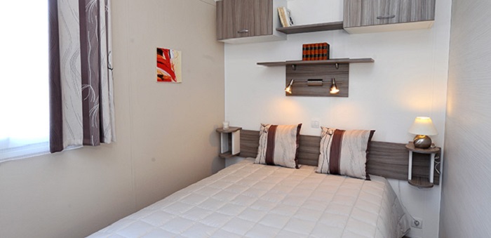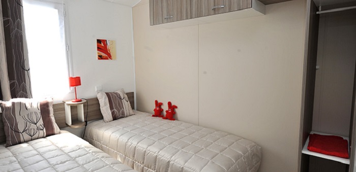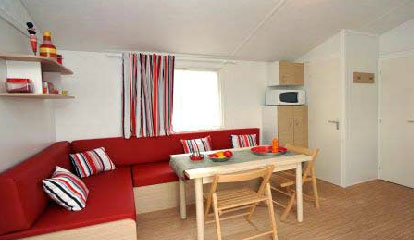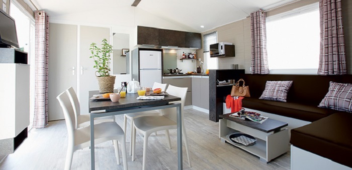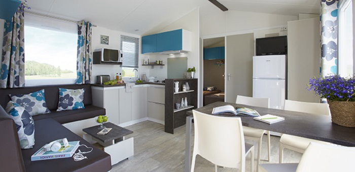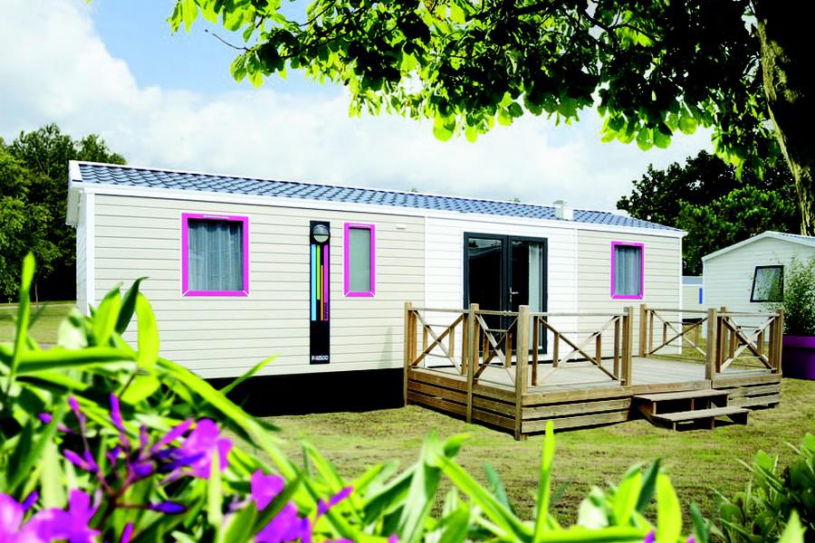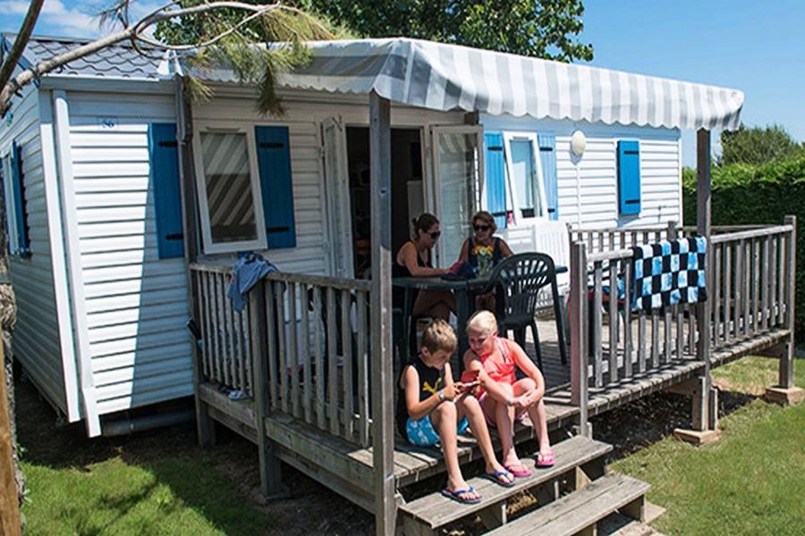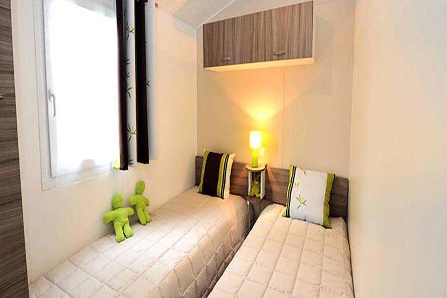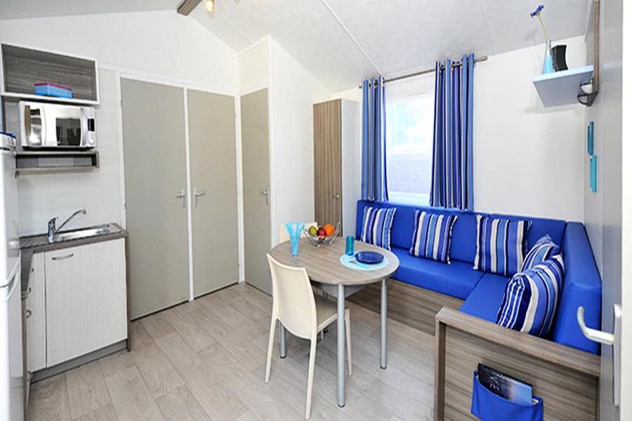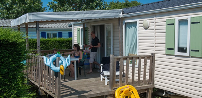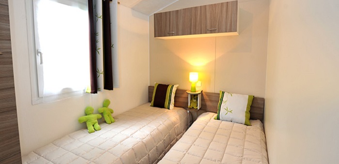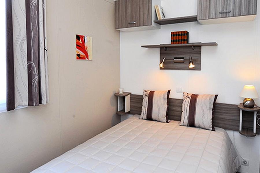 Le mobil home 3 pièces de 28m² pouvant accueillir de 4 à 5 personnes est composé d'une kitchenette, d'une salle de douche, de WC séparés, d'une chambre comprenant 1 lit double, d'une seconde chambre avec deux lits simples, un salon avec banquette convertible en lit deux couchages et d'une terrasse. Possibilité d'intégrer un lit bébé dans la chambre double. Certains modèles sont accessibles aux personnes à mobilité réduite (il est important de vérifier la disponibilité avant de réserver)