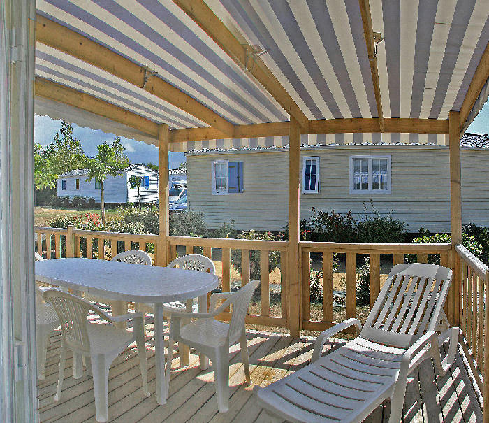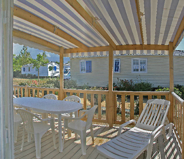 Le mobil Home de 36m² pouvant accueillir de 6/8 personnes est composé d'un salon avec banquette convertible en lit pour 2 personnes, d'un coin cuisine équipé d'une chambre avec un lit double, de 2 chambres avec 2 lits simples, d'une salle de bains avec douche et lavabo, de toilettes indépendants et d'une terrasse couverte ou intégrée avec salon de jardin.