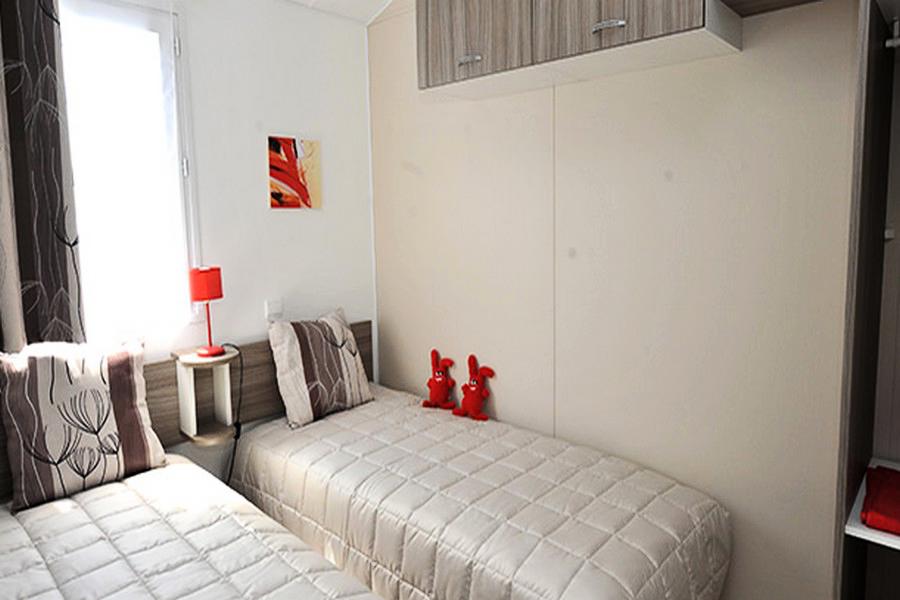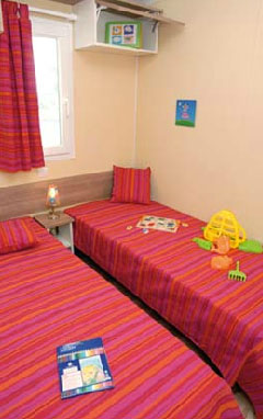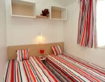 Le mobil home 3 pièces de 28m² pouvant accueillir de 4 à 5 personnes est composé d'un salon avec banquette convertible en lit deux couchages,une kitchenette, une chambre comprenant 1 lit double, une seconde chambre avec deux lits simples, d'une salle de douche, de WC séparés et d'une terrasse. Possibilité d'intégrer un lit bébé dans la chambre double. Ancienneté: De 7 à 10 ans Certains modèles sont accessibles aux personnes à mobilité réduite (il est important de vérifier la disponibilité avant de réserver)