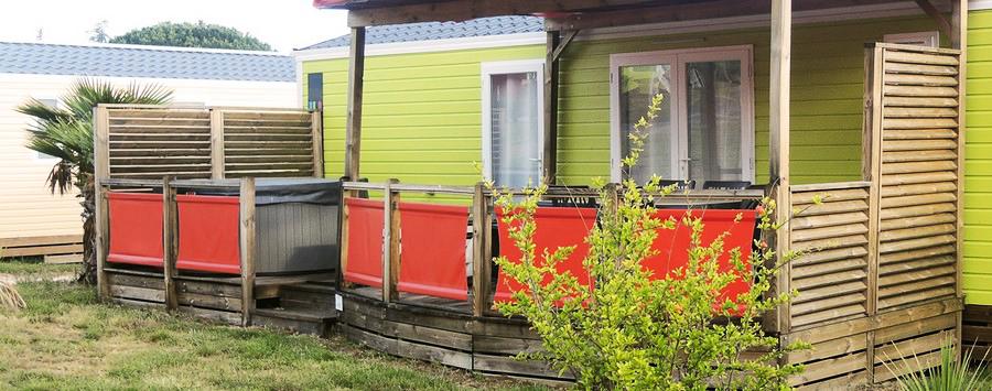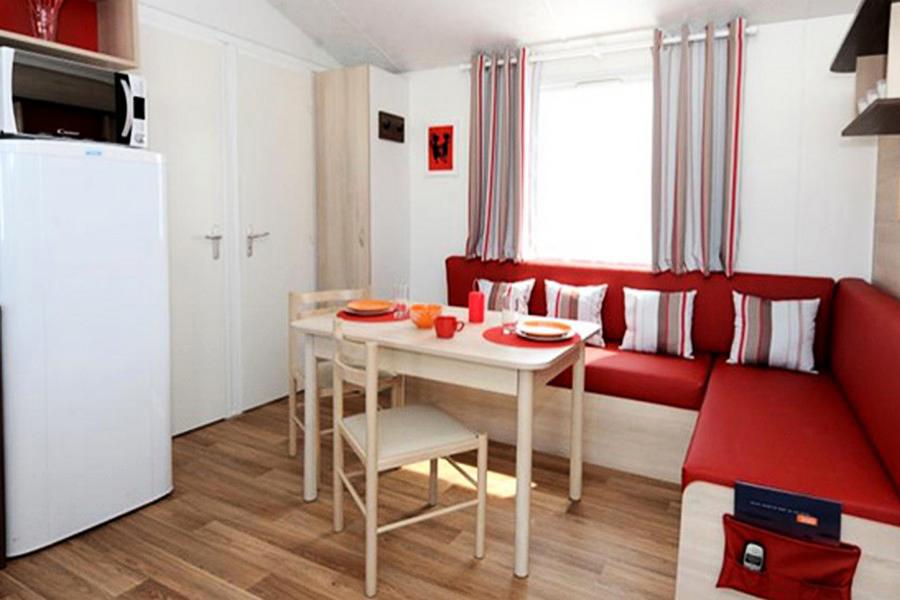 Mobil Home de 32m² pour 4/6 personnes composé d'un coin cuisine équipé, d'un séjour avec banquette convertible en lit pour 2 personnes, d'une chambre avec un lit double, d'une chambre avec 2 lits simples, d'une salle de bains avec douche et lavabo, de toilettes indépendants et d'une terrasse couverte ou semi-couverte.