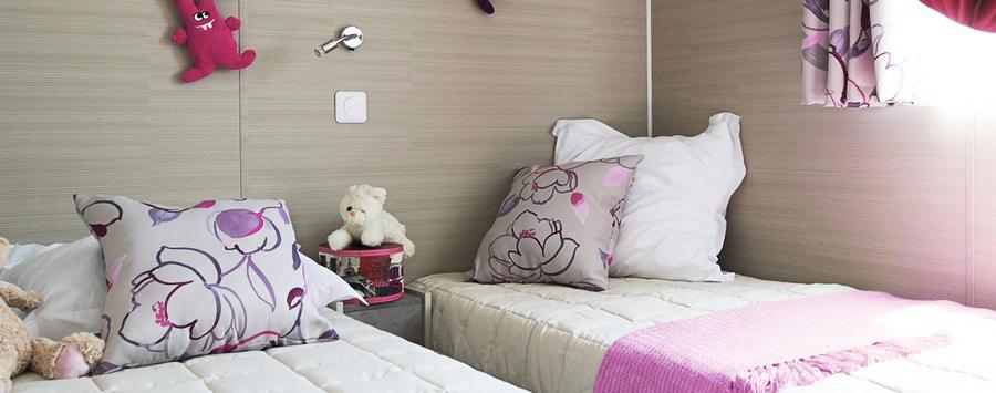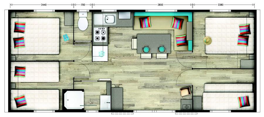 Mobil home 4 pièces pour 6 personnes de 32m² composé d'une kitchenette, d'un coin salon, d'une chambre comprenant un lit double, deux autres chambres comprenant chacune 2 lits simples, d'une salle de douche et de WC séparés.