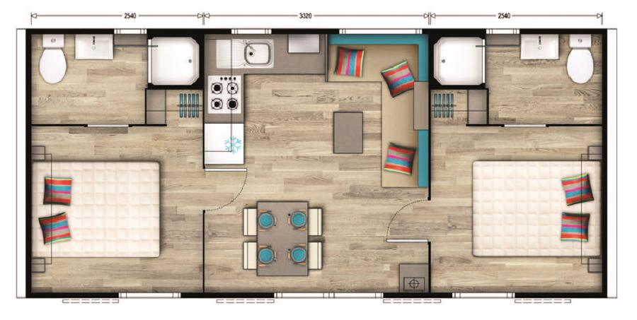 Mobil-home 3 pièces 4 personnes de 32m² composé d'un séjour, d'un coin repas, d'une kitchenette équipée, de 2 suites parentales, l'une avec lit double, l'autre avec 2 lits simples, de deux salles de douche avec WC attenantes aux chambres et d'une terrasse semi-couverte.
