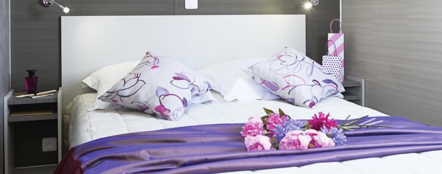 Le mobil home 3 pièces de 28m² pouvant accueillir de 4 à 5 personnes est composé d'un salon avec banquette convertible en lit deux couchages, d'une kitchenette, d'une chambre comprenant 1 lit double, d'une seconde chambre avec deux lits simples, d'une salle de douche, de WC séparés et d'une terrasse. Possibilité d'intégrer un lit bébé dans la chambre double. Ancienneté: De plus de 10 ans Certains modèles sont accessibles aux personnes à mobilité réduite (il est important de vérifier la disponibilité avant de réserver)