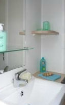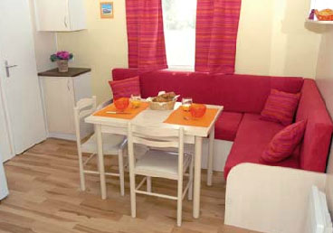Mobil Home de 32m² pour 4/6 personnes composé d'un séjour avec banquette convertible en lit pour 2 personnes, d'un coin cuisine équipé, d'une chambre avec un lit double, d'une chambre avec 2 lits simples, d'une salle de bains avec douche et lavabo, des toilettes indépendants et d'une terrasse couverte ou semi-couverte.