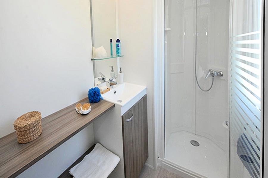 Mobil-home 4 pièces 6 personnes de 40m² composé d'un séjour, d'un coin repas, d'une kitchenette équipée, d'une suite parentale avec mini-dressing, de 2 chambres avec 2 lits simples, d'une salle de douche dans la suite parentale , d'une salle d'eau attenante aux 2 autres chambres, de WC séparés et d'une terrasse semi-couverte.