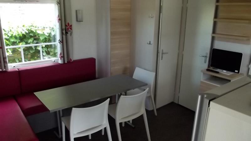 Mobil-home 3 pièces 4/6 personnes de 27m² composé d'un séjour avec un canapé convertible pour deux personnes, d'une kitchenette équipée, d'un coin repas, d'une chambre avec un lit double (140x190), d'une seconde chambre avec deux lits simples (80x190), d'une salle de douche avec WC séparé et d'une terrasse semi-couverte de 11m².