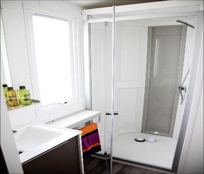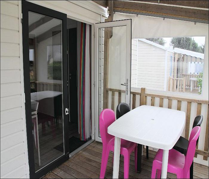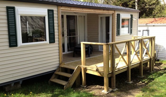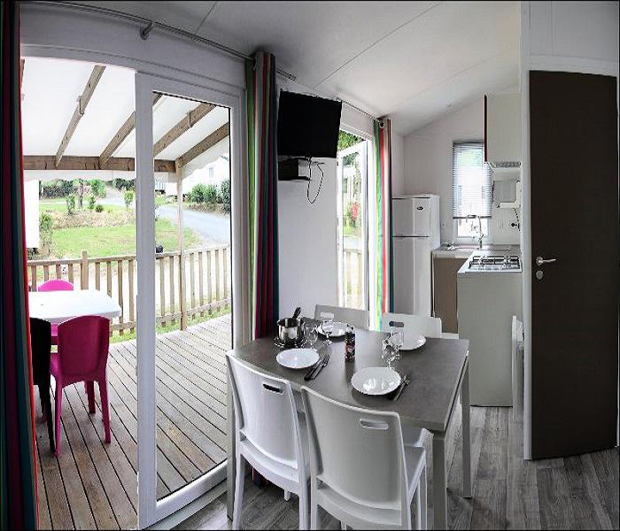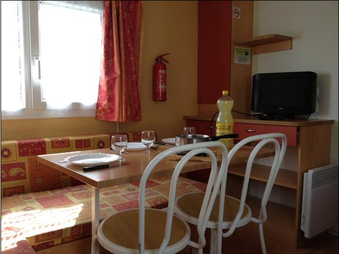 Le mobile home Confort comprend un espace salon/repas avec banquette, un coin cuisine équipé, ainsi qu?une salle d'eau avec cabine de douche et lavabo, WC séparés. Il est composé d?une chambre avec un lit double.A l?extérieur, le mobil home dispose d?une terrasse semi-couverte avec salon de jardin.