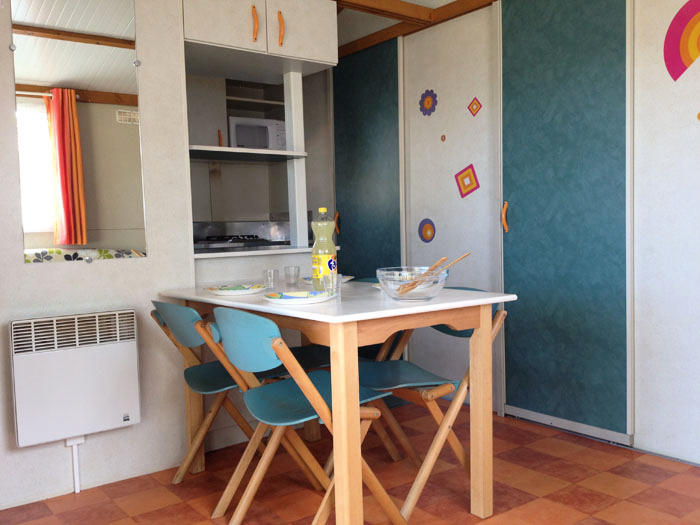 Le mobile home Confort comprend un coin cuisine avec plaque de cuisson, réfrigérateur, micro-ondes, cafetière électrique, ustensiles de cuisine et chauffage. Le camping fournit les couettes et les oreillers.