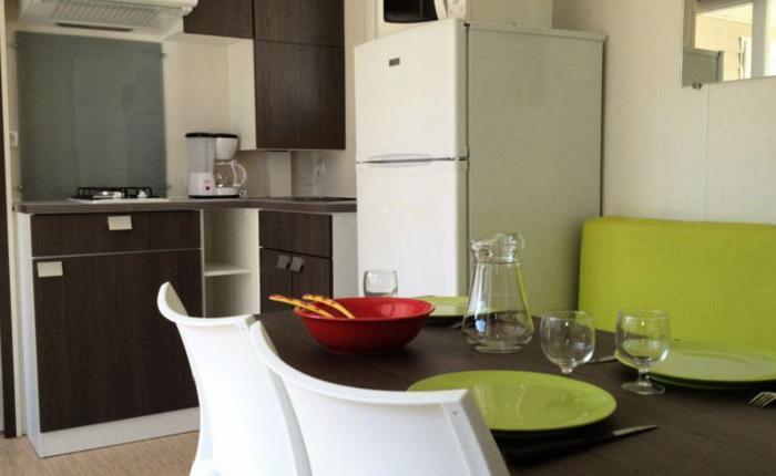 Le Mobil Home comprend un coin cuisine équipé avec plaque de cuisson, réfrigérateur ou frigo/congélateur selon modèle, micro-ondes, cafetière électrique, ustensiles de cuisine.