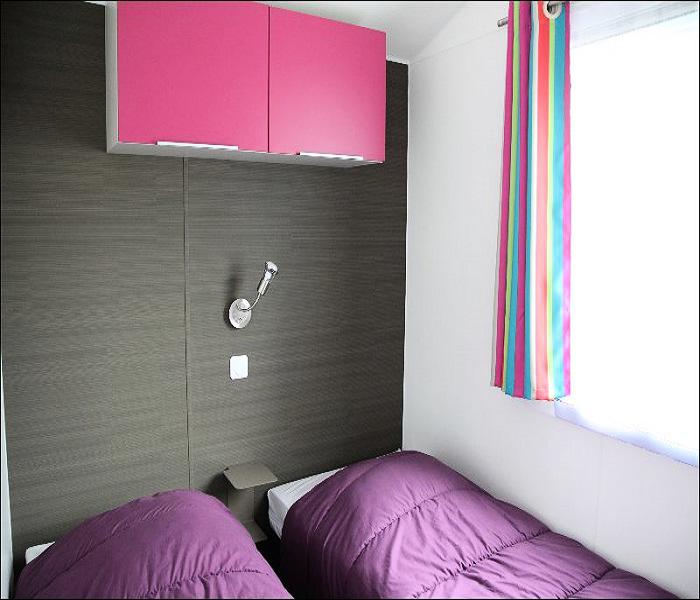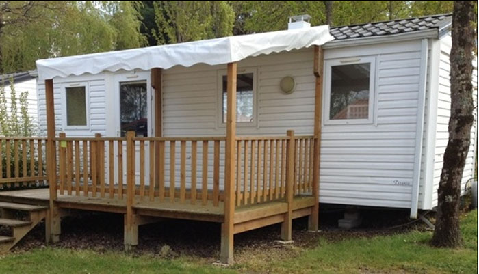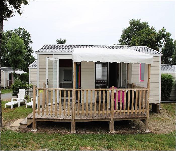 Mobil Home Loisirs 3 Pièces 4/6 Personnes de 25 à 27m² composé d'un coin salon, d'un coin cuisine équipé, d'une chambre avec 1 lit double, d'une chambre avec 2 lits simples, d'une salle d'eau avec douche et de WC séparés. Terrasse semi couverte avec salon de jardin.
