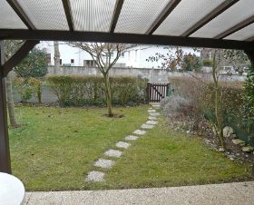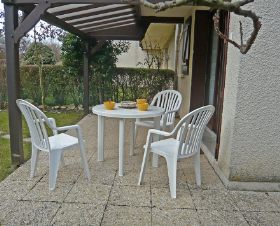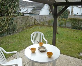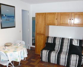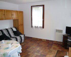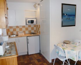 Studio 18 m2, au rez-de-chaussée, situation sud: séjour/salle à manger avec 1 divan-lit double (140 cm), Télévision numérique et écran plat. Sortie sur le jardin, sur la terrasse. Coin cuisine (2 plaques de cuisson, cafetière électrique, combiné micro-ondes). Douche/WC. Chauffage électrique. Terrasse 12 m2, jardin 80 m2. Meubles de terrasse, barbecue. A disposition: lit bébé. Place de parking No 30.