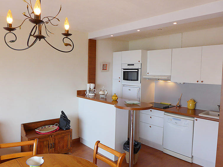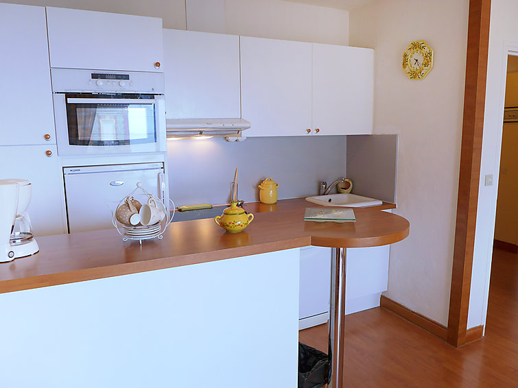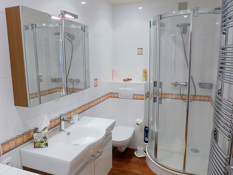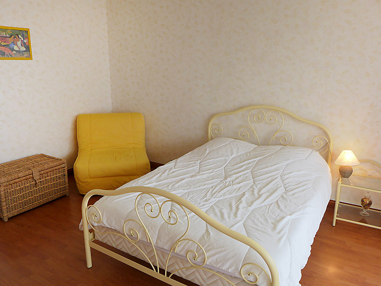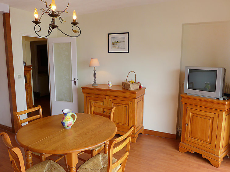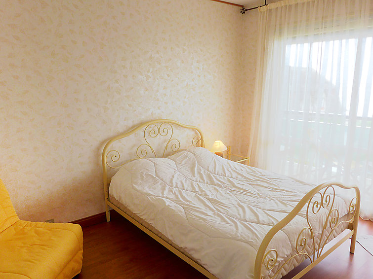Apt 2 pièces 43 m2 au 2ème étage, situation nord: séjour/salle à manger avec 1 divan-lit double (140 cm), TV. Sortie sur le balcon. 1 chambre avec 1 grand-lit (140 cm). Sortie sur le balcon. Cuisine ouverte (lave-vaisselle, 4 plaques vitrocéramique, cafetière électrique, combiné micro-ondes) avec bar. Douche/WC. A disposition: lave-linge, fer à repasser.