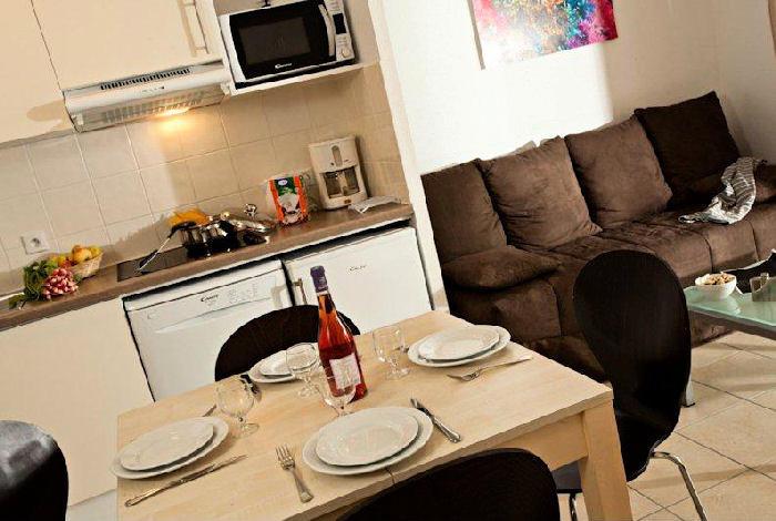 L'appartement dispose d'une cuisine équipée avec réfrigérateur, 4 plaques vitrocéramiques, four micro-ondes grill, lave-vaisselle, cafetière électrique, bouilloire et rangement. L'équipement de l'appartement comprend également télévision, climatisation réversible, table et fer à repasser et aspirateur. Wifi payant (différentes formules)