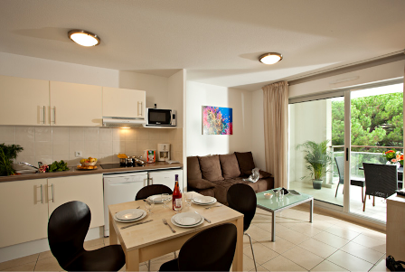 27 m2 avec loggia ou terrass de 7 m2 min. Séjour avec canapé lit gigogne pour 2 personnes. Kitchenette avec réfrigérateur 4 plaques vitrocéramiques four micro-ondes grill lavevaisselle cafetière électrique et rangement bouilloire electrique Salle de bains et WC. Planche et fer à repasser. Aspirateur. TV Climatisation réversible. Loggia ou terrasse avec mobilier de jardin.