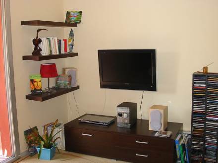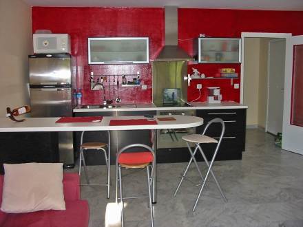 Apt 2 pièces 50 m2 au 1er étage: séjour/salle à manger avec 1 divan-lit double (160 cm), TV (câblée), lecteur CD et DVD. 1 chambre avec 1 grand-lit (140 cm). Cuisine ouverte (4 plaques de cuisson, four, four micro-ondes). WC séparé, bains ou douche. Chauffage électrique. A disposition: lave-linge. Place de parking No 158.