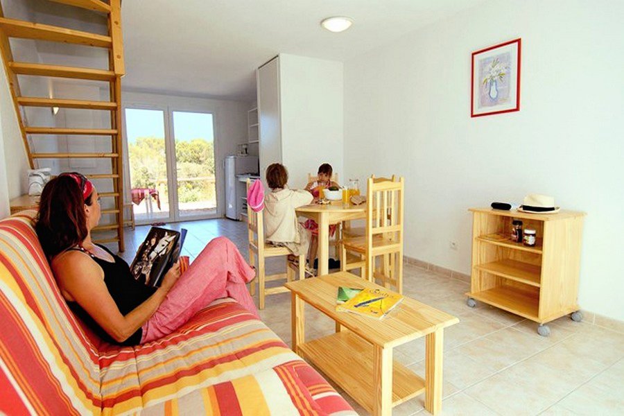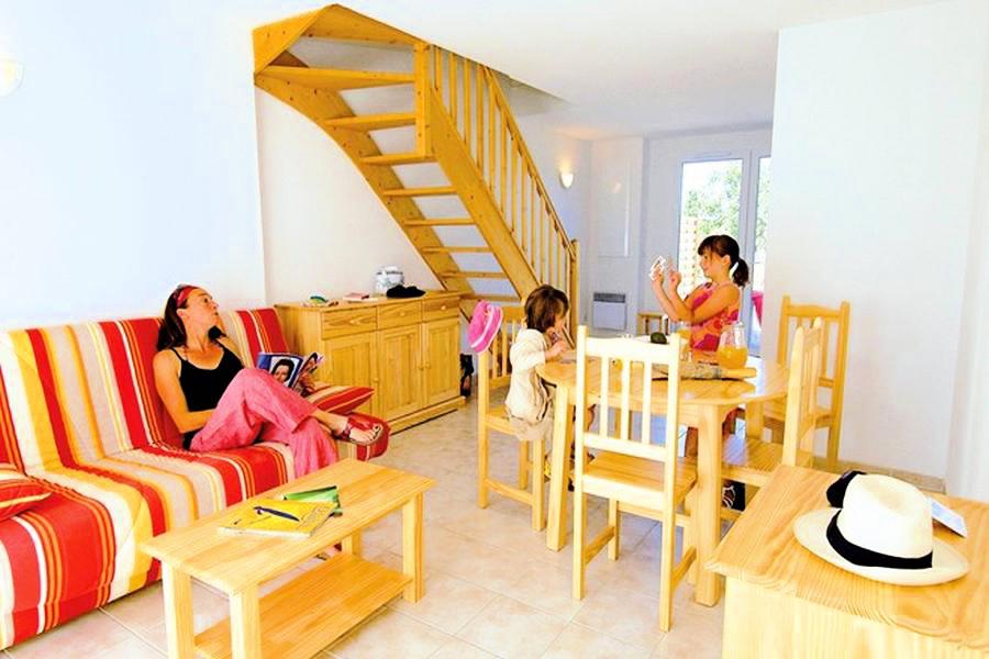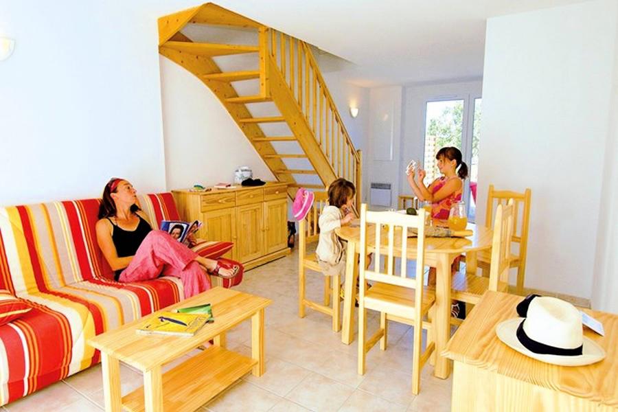 Maisonnette de 72m² de 4 pièces pour 6 à 8 personnes composée d'un séjour avec un canapé-lit pour 2 personnes, d'une chambre avec 2 lits simples, d'une chambre avec 2 lits superposés, d'une chambre avec un lit double, d'une kitchenette équipée, d'une salle de bains ou de douche avec WC, et de WC séparés supplémentaires. A noter : les chambres sont à l'étage.