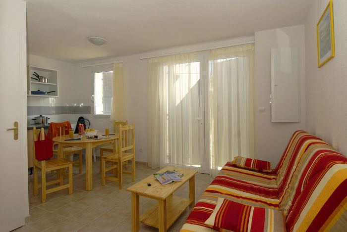 Maisonnette de 40m² de 3 pièces pour 6 personnes composée d'un séjour avec un canapé-lit pour 2 personnes, d'une chambre avec 2 lits simples ou 2 lits superposés, d'une chambre avec un lit double, d'une kitchenette équipée, d'une salle de douche et de WC séparés. A noter : les chambres sont à l'étage.