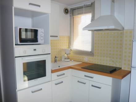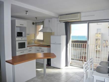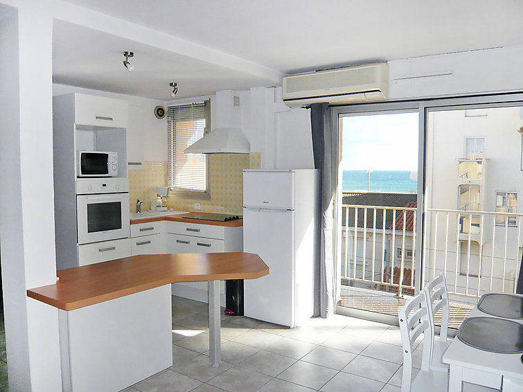 "CYTHERE", apt 2 pièces 39 m2 au 3ème étage: séjour/salle à manger avec 1 divan-lit double et TV (écran plat). Sortie sur le balcon. 1 chambre avec 1 lit double. Cuisine ouverte (4 plaques de cuisson, four, four micro-ondes) avec table pour les repas. Douche, WC séparé. Air-conditionné. Vue partielle sur la mer. A disposition: lave-linge.