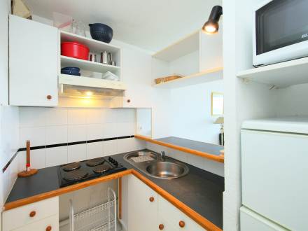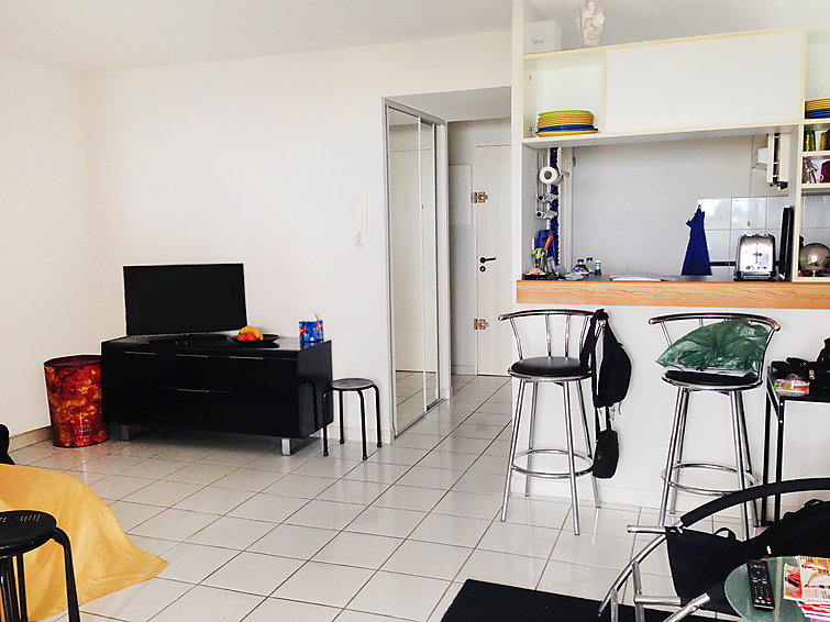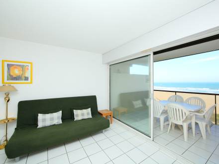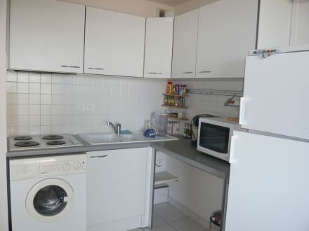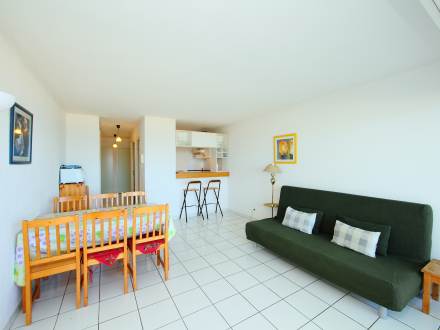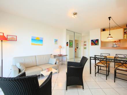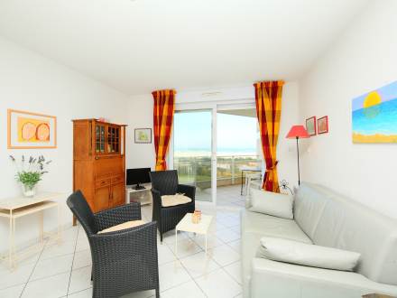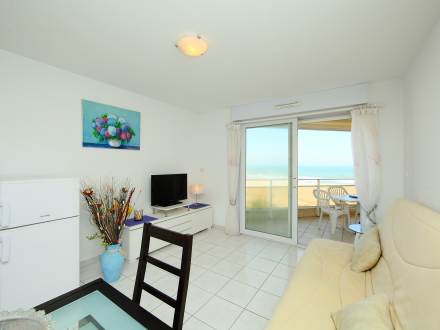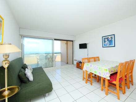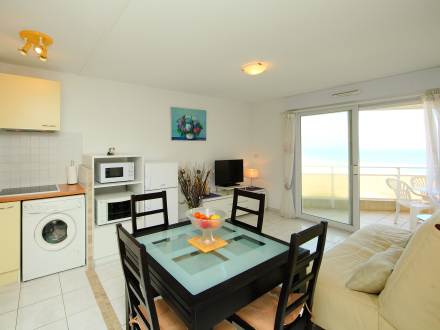 Pour avoir plus de détails et réserver cet hébergement, choisissez une date ci-dessus et cliquez sur voir l'offre ! Vous serez redirigé vers le site proposant la location.Apt 2 pièces 37 m2 au 1er étage: séjour/salle à manger avec 1 divan-lit double et écran plat. Sortie sur la terrasse. 1 chambre avec 1 grand-lit (140 cm). Cuisine ouverte (4 plaques de cuisson, mini-four, plaque vitro céramique, combiné micro-ondes). Salle de bains, WC séparé. Terrasse 14 m2. Meubles de terrasse. Vue sur la mer. A disposition: lave-linge. Place de parking No 25.