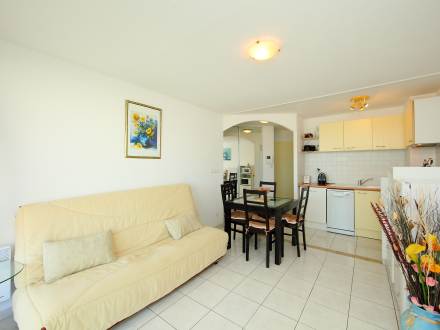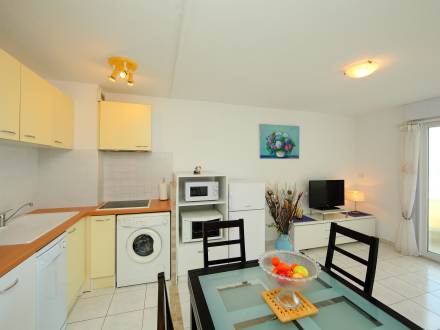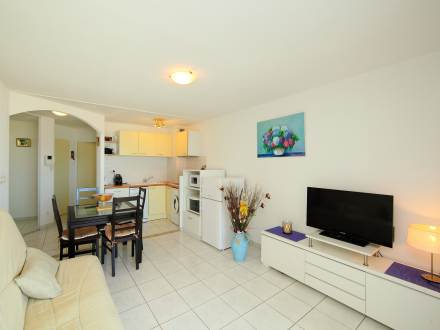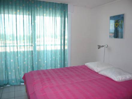Pour avoir plus de détails et réserver cet hébergement, choisissez une date ci-dessus et cliquez sur voir l'offre ! Vous serez redirigé vers le site proposant la location.Apt 3 pièces 48 m2 au 1er étage. Aménagement confortable: séjour/salle à manger avec 1 divan-lit (140 cm, longueur 190 cm), table pour les repas et TV. Sortie sur la terrasse. 2 chambres, chaque chambre avec: 1 grand-lit (2 x 140 cm, longueur 190 cm). Sortie sur la loggia. Coin cuisine (4 plaques de cuisson, lave-vaisselle, four micro-ondes, cafetière électrique). Douche, WC séparé. Terrasse 8 m2. Meubles de terrasse. Belle vue sur la mer. A disposition: lave-linge, fer à repasser. Internet (Connexion WIFI, en sus). Garage No 65. Veuillez noter: détecteur de fumée.