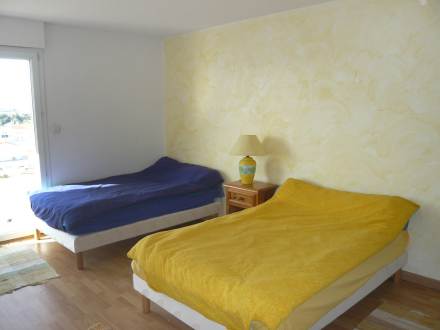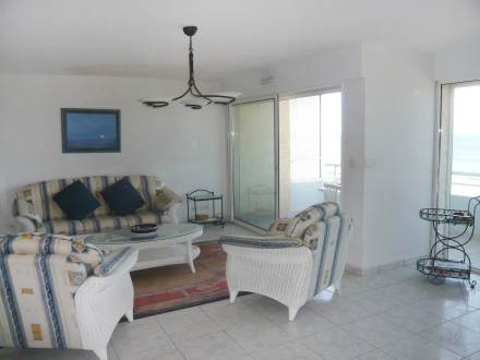 Apt 4 pièces 160 m2 sur 2 niveaux au 5ème étage, aménagement très confortable et agréable: séjour avec 1 divan-lit double et TV. Sortie sur la terrasse. Cuisine (4 plaques de cuisson, four, lave-vaisselle, four micro-ondes) avec bar, table pour les repas. Sortie sur le balcon. WC séparé. À l'étage supérieur: 1 chambre avec 1 grand-lit (1 x 160 cm), douche. Sortie sur la terrasse. 1 chambre avec 2 lits (120 cm). 1 chambre avec 2 lits (120 cm). Salle de bains, WC séparé. Air-conditionné. 2 terrasses. Belle vue panoramique sur la mer. A disposition: lave-linge, sèche-linge. Garage No 4.