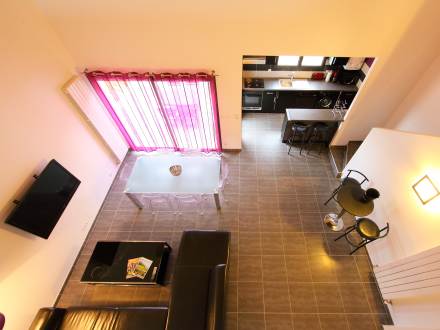 "TIXADOR", apt 3 pièces 86 m2 sur 2 niveaux au 1er étage, aménagement confortable et agréable: séjour/salle à manger avec 1 divan-lit double et écran plat. Sortie sur la terrasse. 1 chambre avec 1 lit double (1 x 140 cm). Cuisine ouverte (4 plaques de cuisson, mini-four, four, lave-vaisselle, four micro-ondes) avec table pour les repas. Salle de bains, WC séparé. À l'étage supérieur: 1 chambre, ouverte avec 1 lit double (1 x 140 cm). Douche, WC séparé. Terrasse 7 m2. Meubles de terrasse. A disposition: lave-linge. Maximum 1 animal/ chien autorisé.