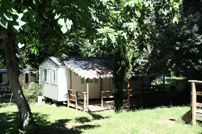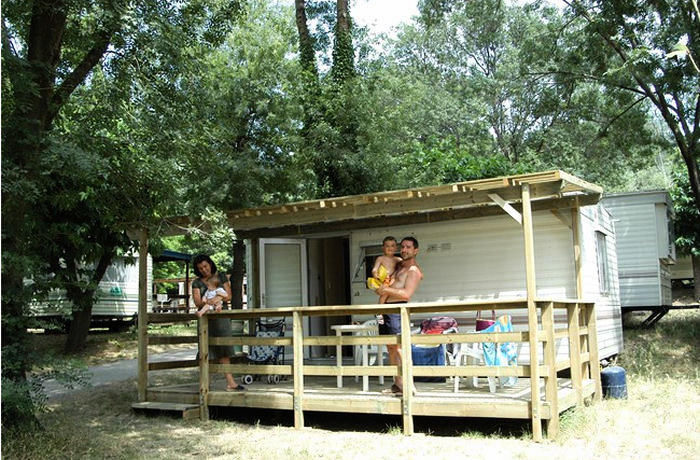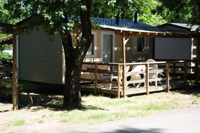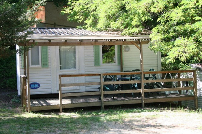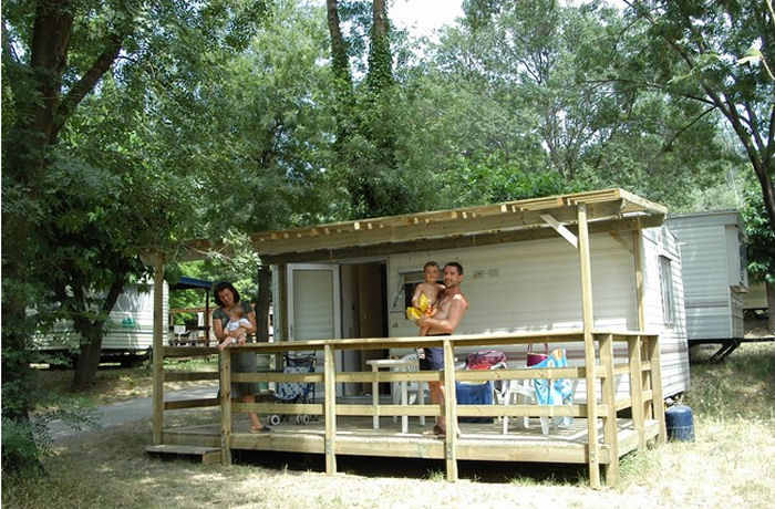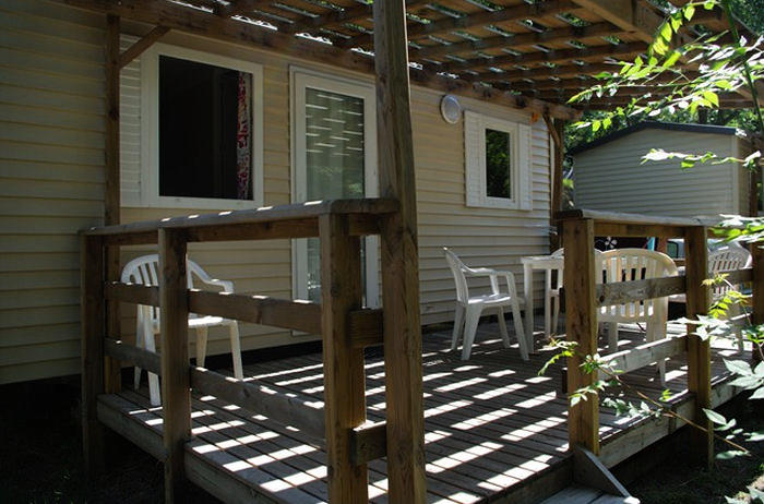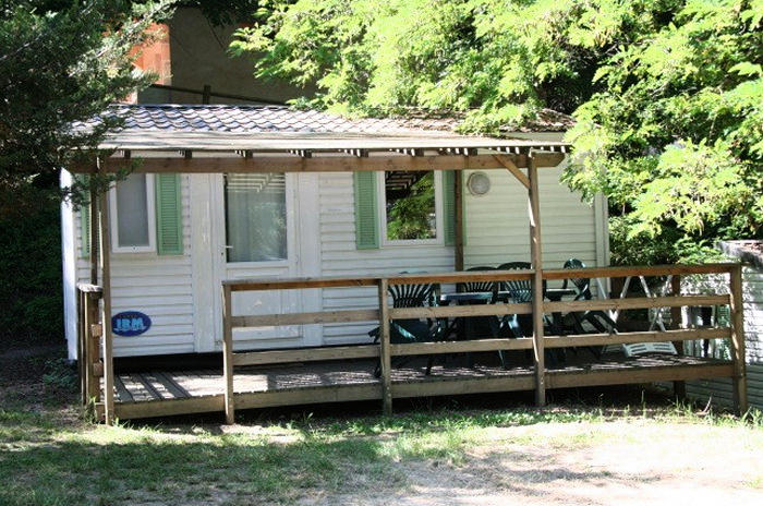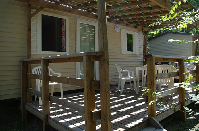 Mobil home pour 4 personnes, composé d'un coin cuisine équipé, d'un salon avec une banquette, d'une chambre avec un lit double, d'une seconde chambre avec 2 lits simples et d'une terrasse en bois. A noter : ce logement ne possède pas de WC ni de salle de bains. Les occupants devront utiliser les sanitaires du camping.