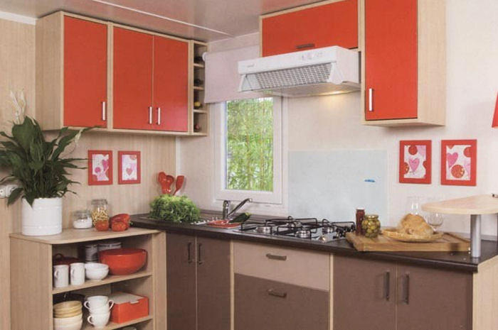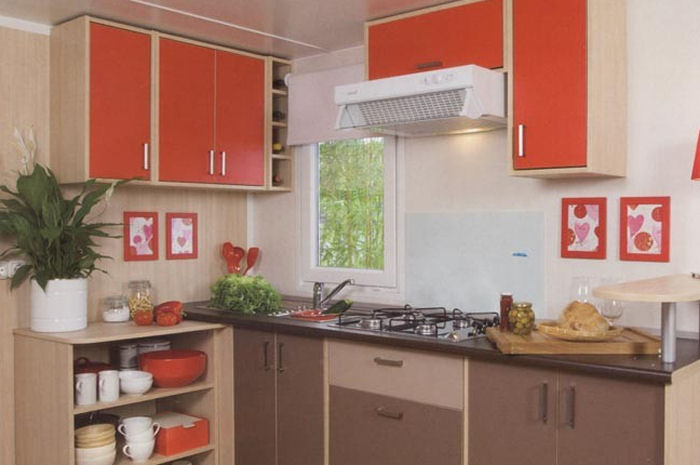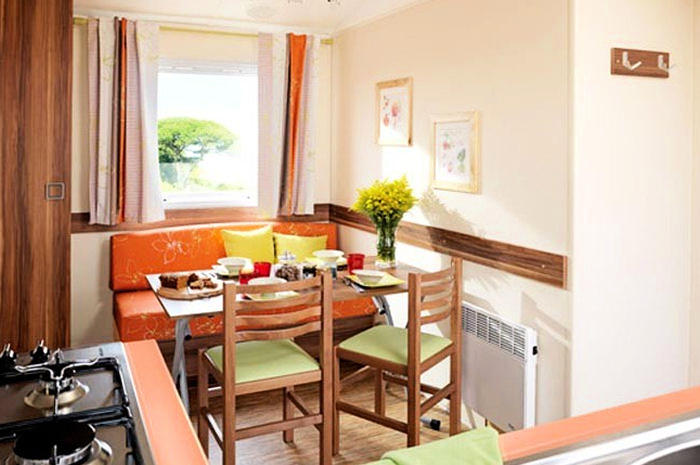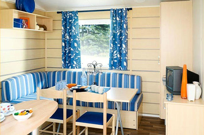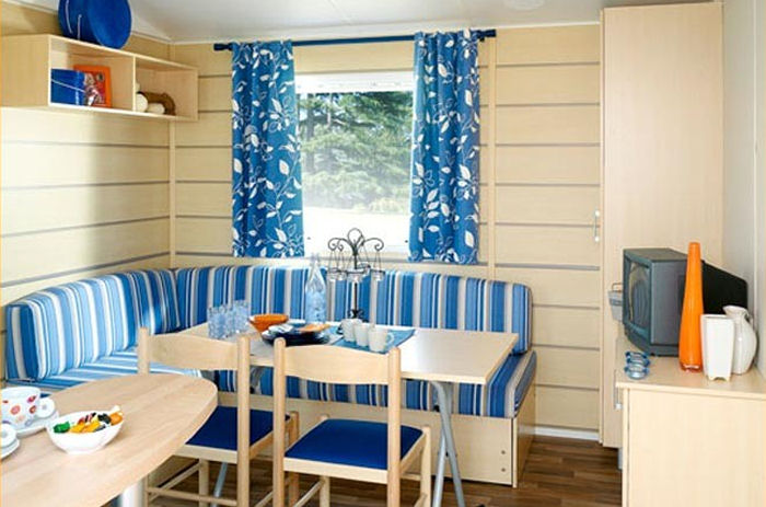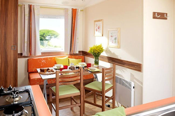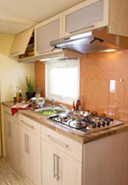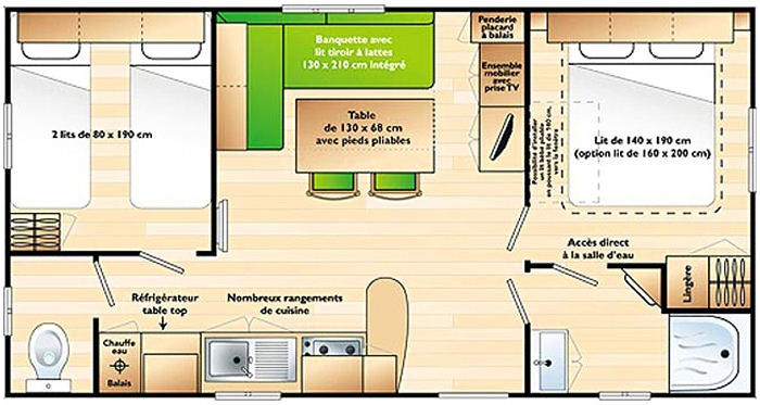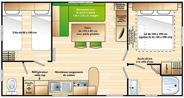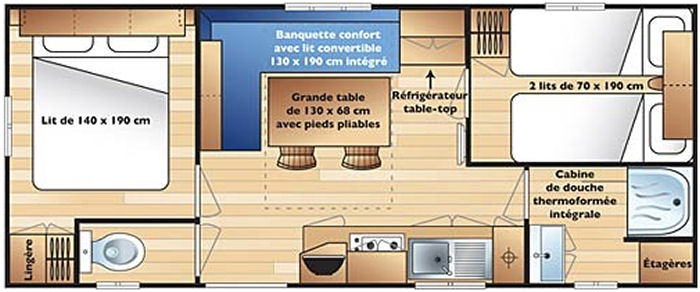 Mobil home d'environ 29m² pour 4/6 personnes, composé d'un coin cuisine, d'un salon avec une banquette convertible en couchage (pour 2 enfants), d'une chambre avec un lit double, d'une seconde chambre avec 2 lits séparés, d'une salle de bains avec douche et WC et d'une terrasse en bois couverte d'une bâche.