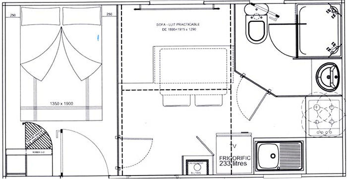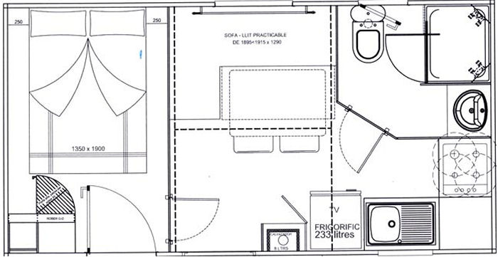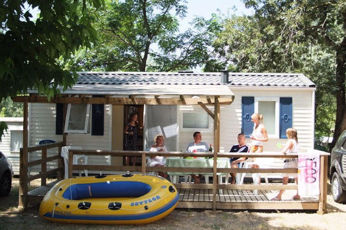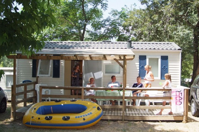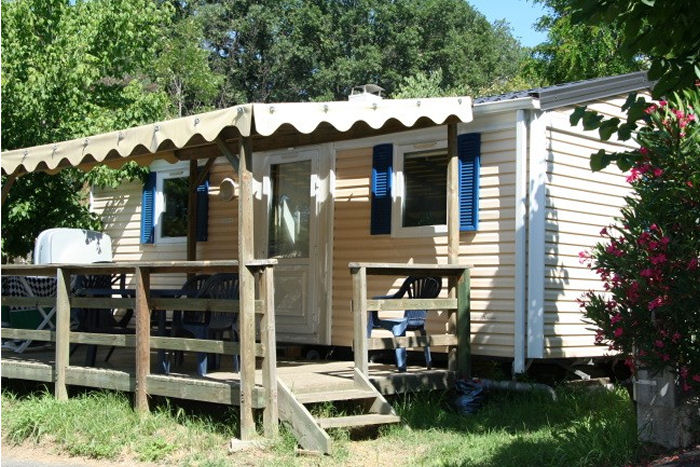 Mobil home récent (2009) d'environ 17m² pour 2 adultes et un enfant de moins de 12 ans, composé d'un coin cuisine équipé, d'un salon avec un banquette convertible en lit pour un enfant de moins de 12 ans, d'une chambre avec un lit double, d'une salle de bains avec douche et WC et d'une terrasse en bois.