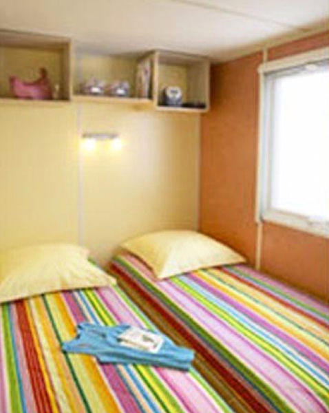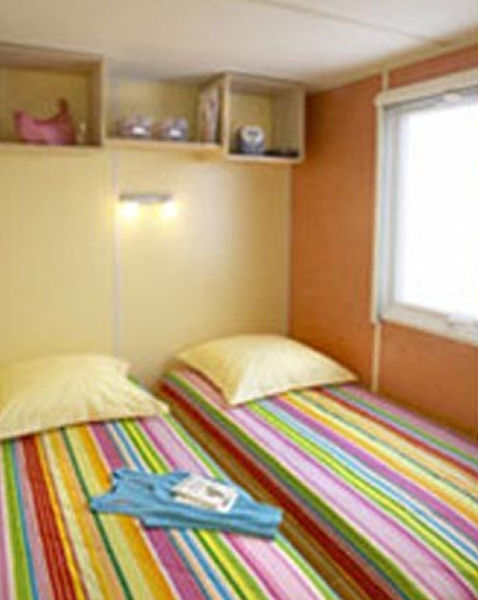 Mobil home récent (2008) d'environ 22m² pour 2 adultes et 2/3 enfants, composé d'un coin cuisine équipé, d'un salon avec une banquette convertible pour 1 enfant, d'une chambre avec un lit double, d'une seconde chambre avec 2 lits simples, d'une salle de bains avec douche et WC et d'une terrasse en bois.