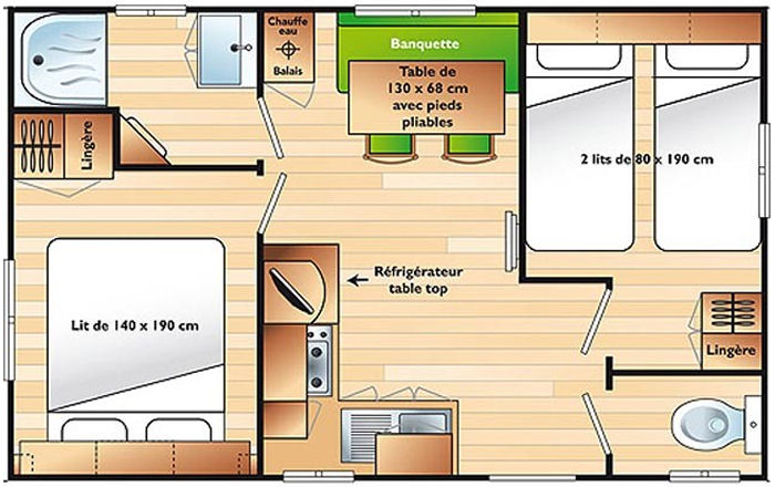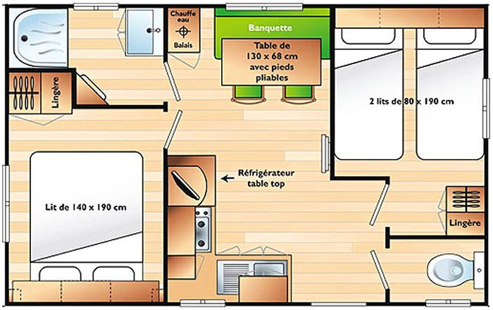 Pour avoir plus de détails et réserver cet hébergement, choisissez une date ci-dessus et cliquez sur voir l'offre ! Vous serez redirigé vers le site proposant la location.Mobil home d'environ 29m² pour 4/6 personnes, composé d'un coin cuisine, d'un salon avec une banquette convertible en couchage (pour 2 enfants), d'une chambre avec un lit double, d'une seconde chambre avec 2 lits séparés, d'une salle de bains avec douche et WC et d'une terrasse en bois couverte d'une bâche.