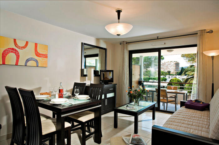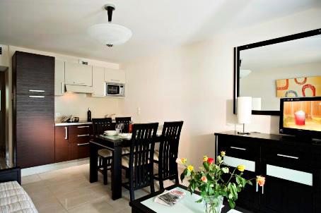 L'appartement dispose d'une kitchenette équipée avec réfrigérateur, 4 plaques vitro-céramiques, four micro-ondes/grill, cafetière électrique, bouilloire, lave-vaisselle et rangement. L'équipement comprend également télévision, aspirateur, planche et fer à repasser et climatisation réversible.