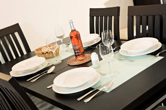 L'appartement dispose d'une kitchenette équipée avec réfrigérateur, 4 plaques vitro-céramiques, four micro-ondes/grill, cafetière électrique, bouilloire, lave-vaisselle et rangement. L'équipement comprend également télévision, aspirateur, planche et fer à repasser et climatisation réversible. Wifi payant.