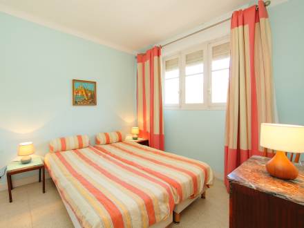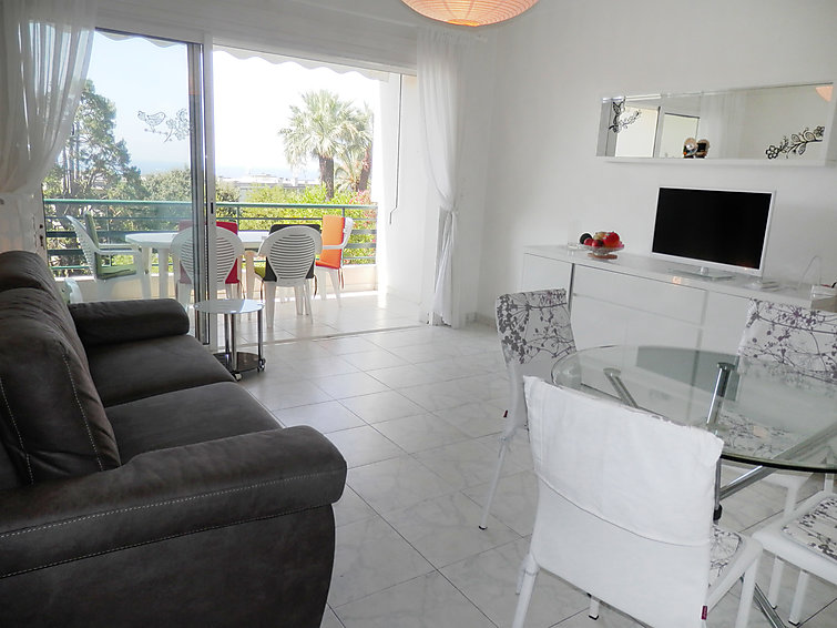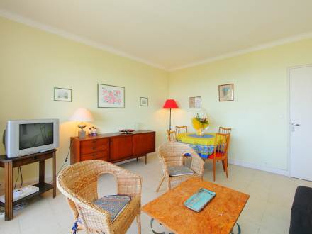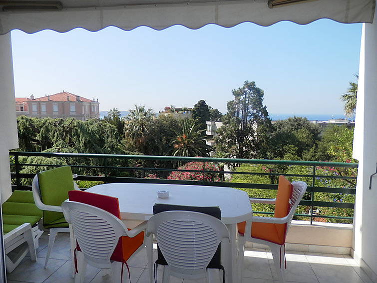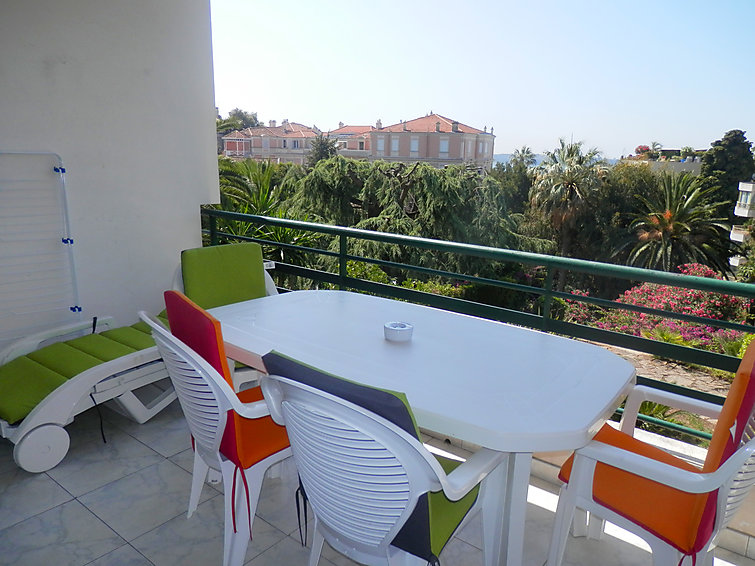 Apt 2 pièces 55 m2 au 2ème étage, aménagement fonctionnel et confortable: séjour/salle à manger avec 1 lit gigogne et TV. Sortie sur la terrasse. 1 chambre avec 2 lits (80 cm). Cuisine (4 plaques de cuisson, four, lave-vaisselle, congélateur). Bain/bidet/WC. Chauffage. Terrasse 10 m2 partiellement couverte, situation sud. Meubles de terrasse. Belle vue sur la mer et le jardin. A disposition: lave-linge.