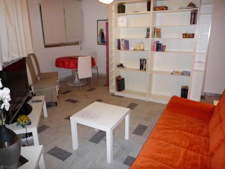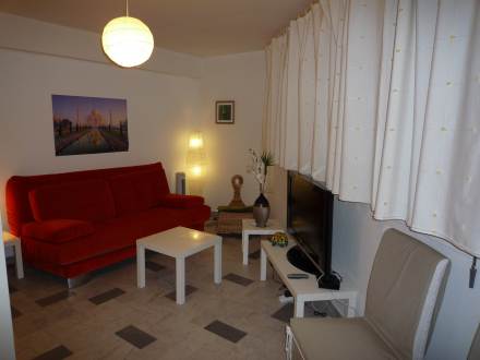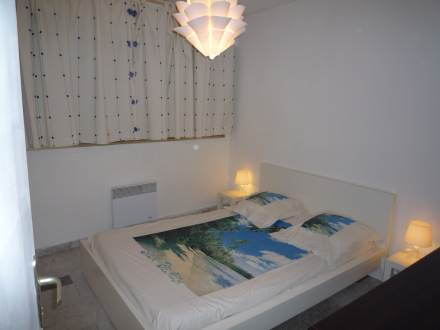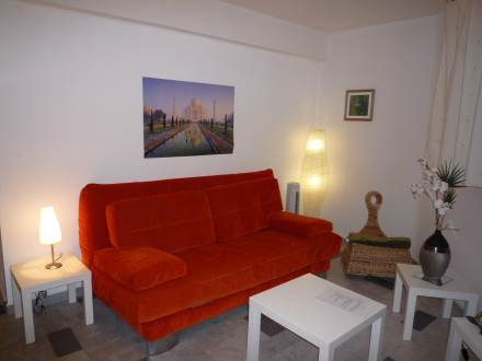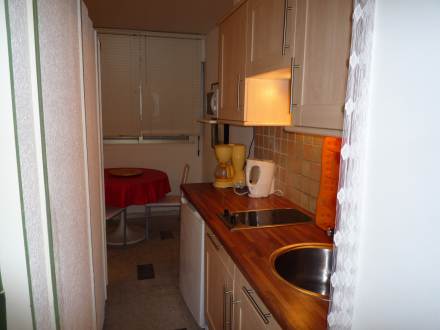 Apt 2 pièces 45 m2, au rez-de-chaussée, rénové en 2008, aménagement confortable et agréable: séjour/salle à manger avec 1 divan-lit double et TV. 1 petite chambre avec 1 grand-lit. Coin cuisine (2 plaques de cuisson, four micro-ondes, cafetière électrique). Salle de bains, WC séparé. A disposition: fer à repasser. Veuillez noter: logement côté rue. Fenêtre coulissante, en partie avec protège-vue. Petit atelier à proximité.