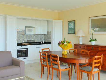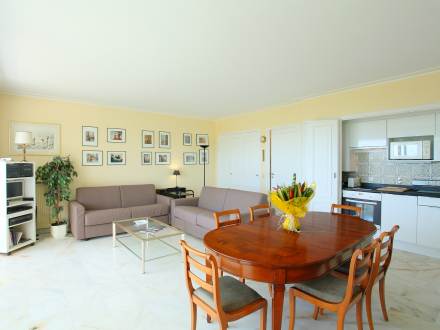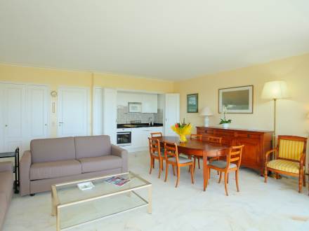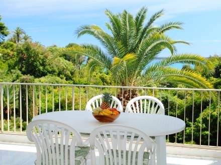 Studio 50 m2 au 1er étage, aménagement confortable: séjour/salle à manger avec baie vitrée avec 2 divans-lits doubles (2 x 140 cm), TV et chaîne stéréo. Sortie sur la terrasse. Coin cuisine (2 plaques de cuisson, four micro-ondes, congélateur, cafetière électrique). Salle de bains, WC séparé. Terrasse 14 m2. Meubles de terrasse. Belle vue sur la mer. A disposition: lave-linge, fer à repasser, sèche-cheveux. Place de parking.