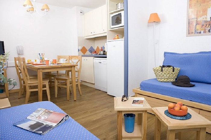 Appartement 2 pièces pour 5 personnes de 24 à 28m² comprenant un séjour avec 2 banquettes lits simples dont 1 avec 1 lit gigogne, une chambre avec 1 lit double, une salle de bain avec douche ou baignoire, des toilettes, une kitchenette et une terrasse ou un balcon.