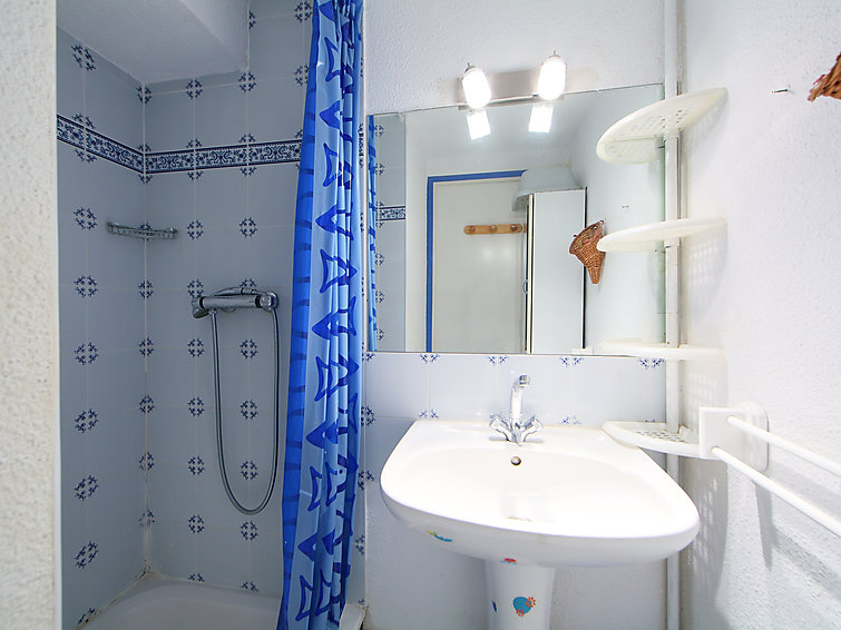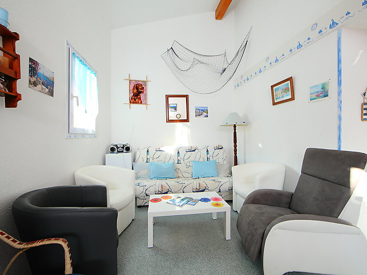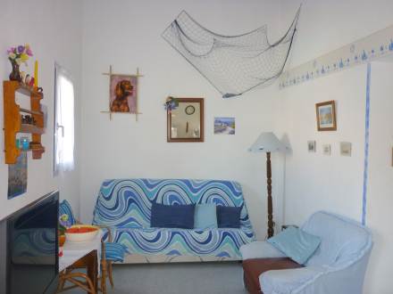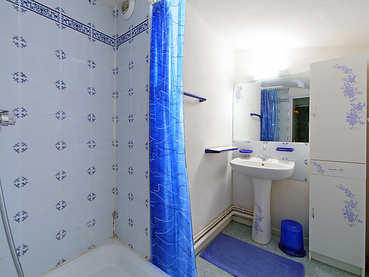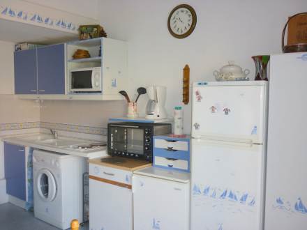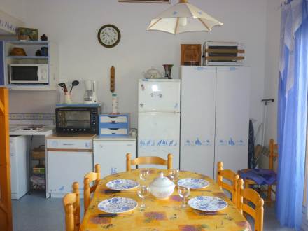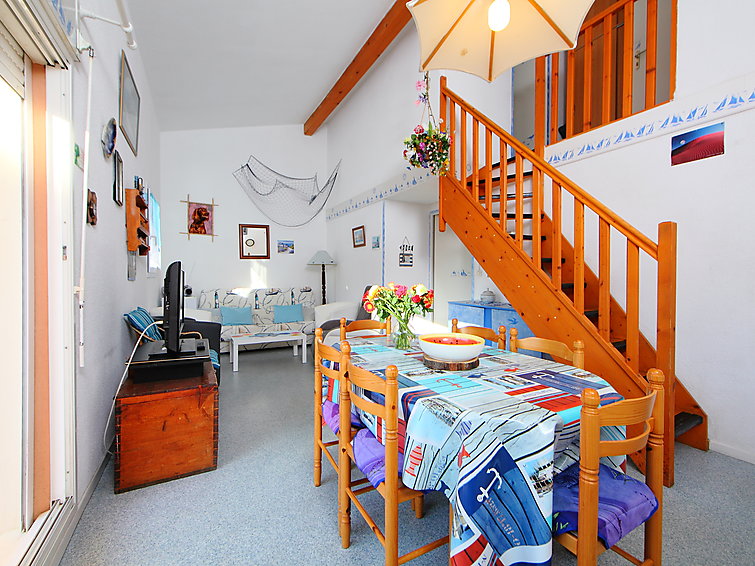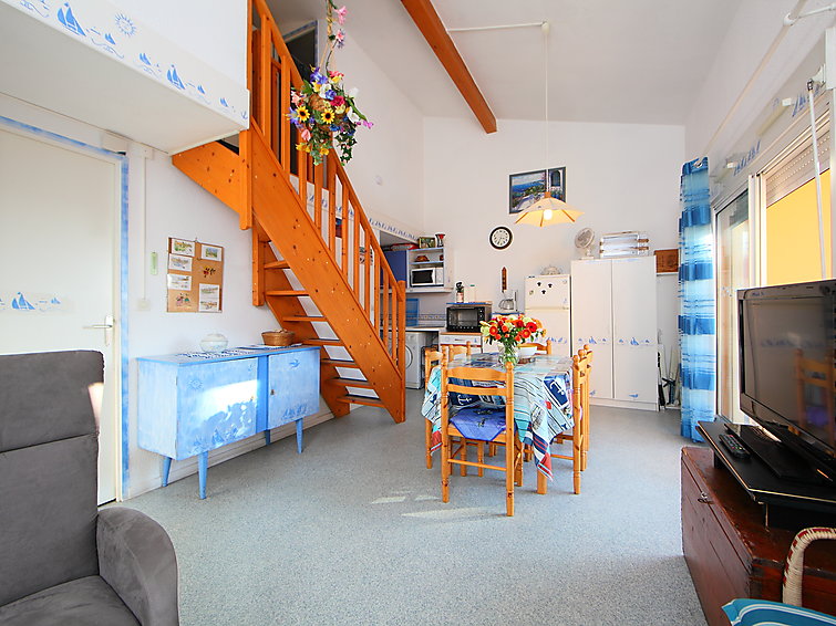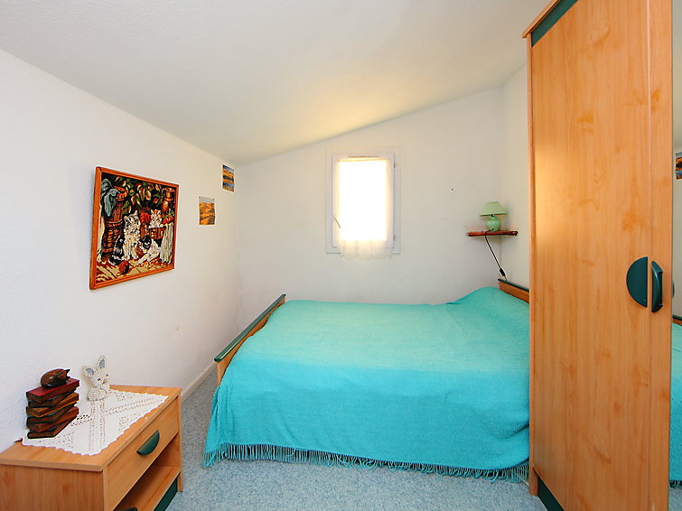 Apt 3 pièces 52 m2 sur 2 niveaux au 2ème étage: séjour/salle à manger avec 1 divan-lit double (130 cm), TV. Sortie sur la terrasse. 1 chambre avec 1 x 2 lits superposés. Cuisine ouverte (2 plaques de cuisson, four, four micro-ondes, congélateur). Douche, WC séparé. À l'étage supérieur: 1 chambre, mansardée avec 1 grand-lit. Douche. Terrasse 9 m2, situation sud-ouest. Meubles de terrasse. Vue sur la piscine. A disposition: lave-linge. Maximum 1 animal/ chien autorisé.