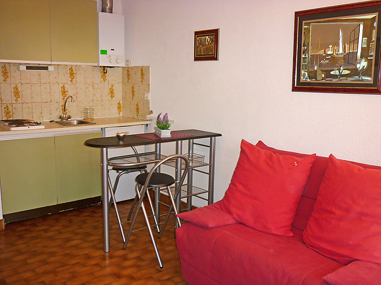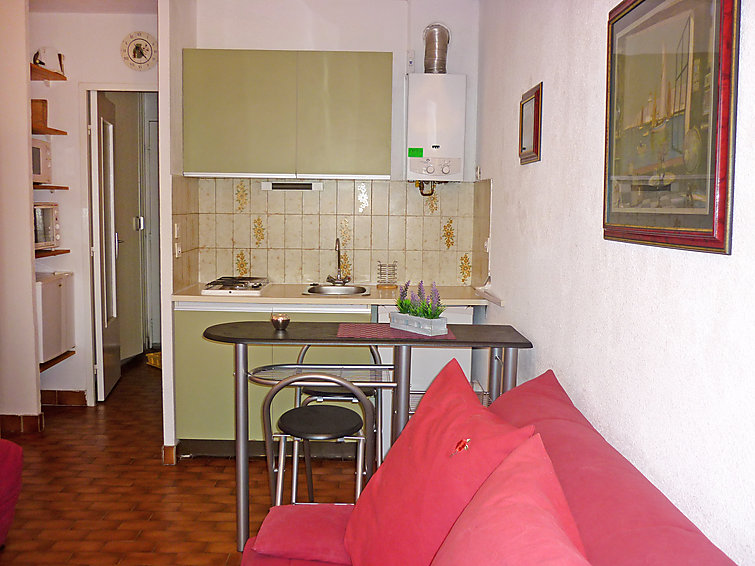 Studio 20 m2 au 2ème étage, aménagement fonctionnel: séjour/chambre à coucher avec baie vitrée avec 1 divan-lit (140 cm), 1 couchage (90 cm), Télévision numérique et radiateur électrique. Sortie sur la loggia. Coin cuisine (2 plaques de cuisson, mini-four, four micro-ondes, congélateur, cafetière électrique) avec coin repas. Salle de bains, douche/WC. Mobilier de balcon, barbecue électrique, loggia. Belle vue éloignée sur le port. A disposition: lave-linge. Une carte de parking gratuit sera donnée à l'arrivée des locataires durant le séjour.