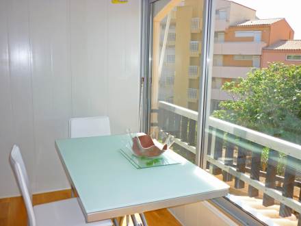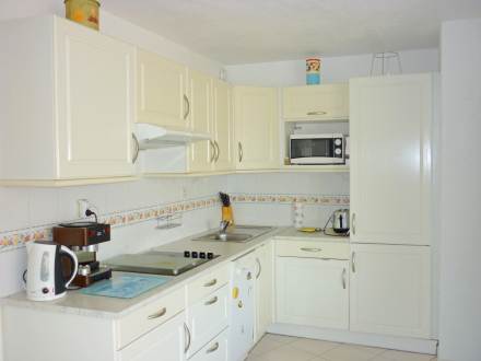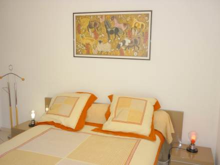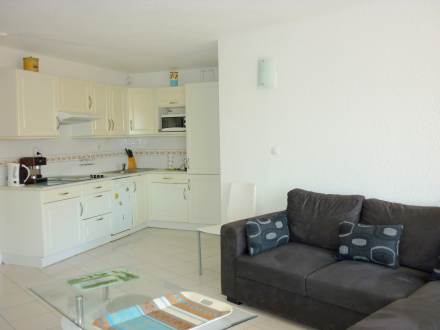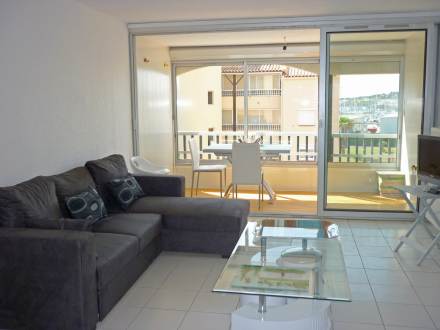 Apt 3 pièces 52 m2 au 1er étage: séjour/salle à manger avec TV (écran plat). Sortie sur la loggia, orientée ouest. 1 chambre avec 1 grand-lit. 1 petite chambre avec 1 divan-lit double. Cuisine ouverte (4 plaques de cuisson, lave-vaisselle, plaque vitro céramique, four micro-ondes). Salle de bains, WC séparé. Chauffage. Loggia. Vue partielle sur le port. Place de parking. Veuillez noter: logement pour non fumeurs.
