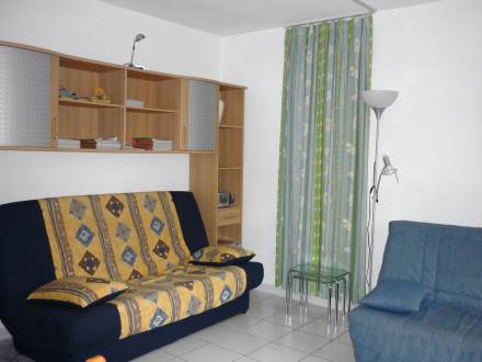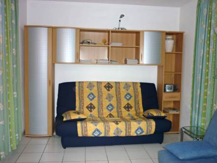 "PORT SUD" studio 25 m2 au 1er étage: séjour avec 2 divans-lits (140 cm, longueur 190 cm), table pour les repas et TV. Sortie sur la terrasse. (2 plaques de cuisson, four, four micro-ondes). Salle de bains, bain/WC. Meubles de terrasse. A disposition: lave-linge.