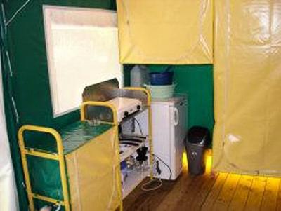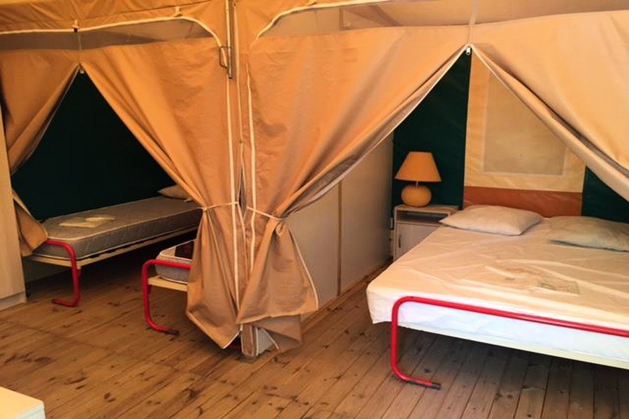 Lodge Toilé Rivière Sans Sanitaire 4 Personnes de 16m² composé d'une chambre avec 1 lit 2 personnes , d'une chambre avec 2 lits 1 personne, d'une cuisine. Le logement ne contient ni salle de bains ni WC.