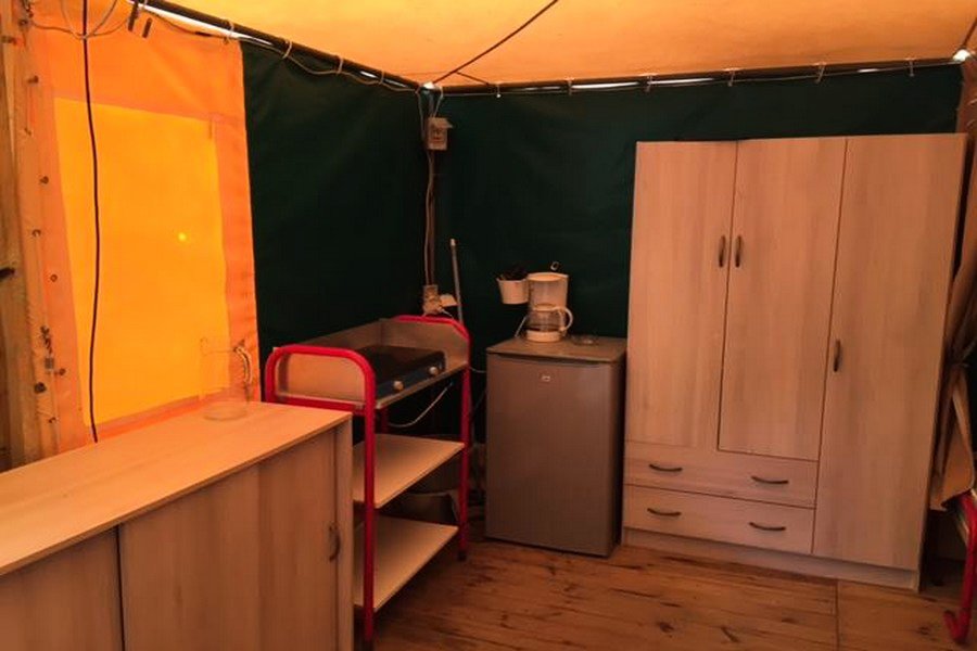 Le Lodge Toilé Rivière Sans Sanitaire 5 Personnes comprend une cuisine avec un réfrigérateur, 1 plaque de cuisson avec 2 feux, une cafetière électrique, vaisselle et couverts.