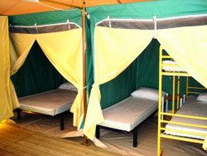 Lodge Toilé Rivière Sans Sanitaire 5 Personnes de 16m² composé d'une chambre avec 1 lit 2 personnes , d'une chambre avec 2 lits 1 personne, d'une cuisine. Le logement ne contient ni salle de bains ni WC.